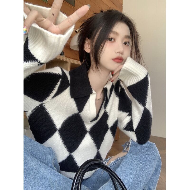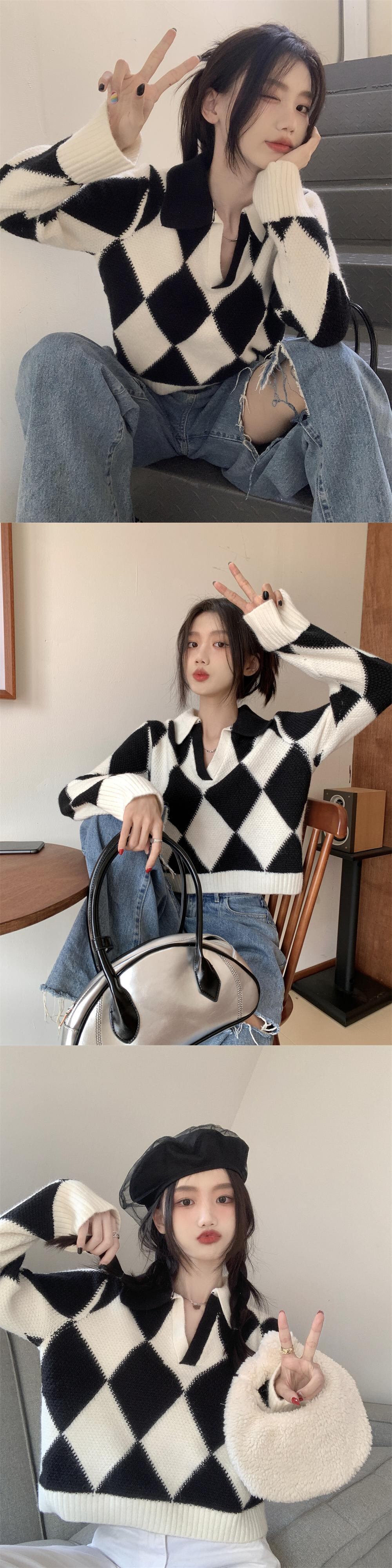 ブラックホワイトVネックプルオーバー セーター オータムルーズニットトップス 秋物 10/5 秋冬 オータム ウインター ナチュラル mi4678176989851