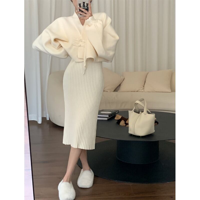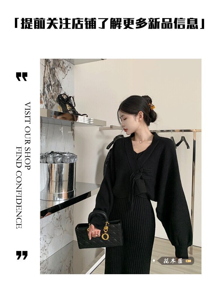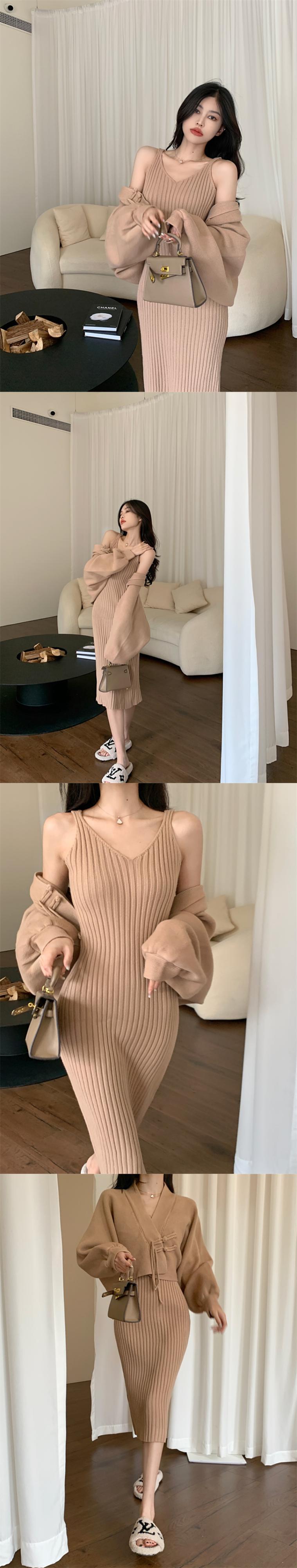 色:ベージュの白いドレス,ベージュカーディガン,ブラックサスペンダースカート,ブラックカーディガンワンピース,Ceeカラードレス,シーカラーカーディガン単品