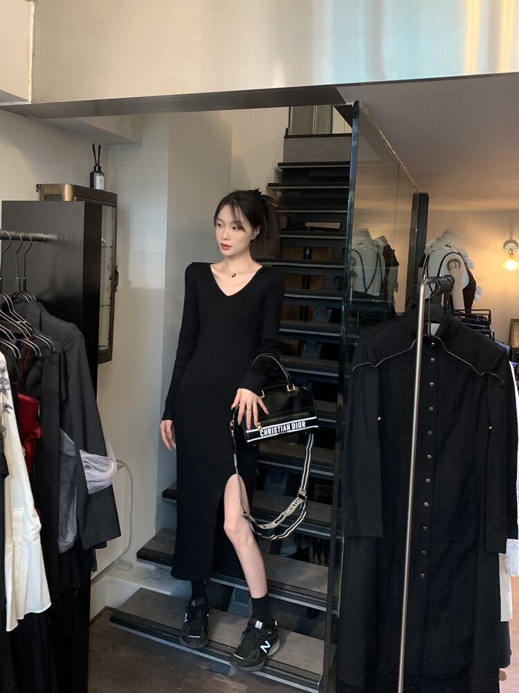 スリムVネックドレス オータムスタンダードニットスカート レトロ 秋物 10/5 秋冬 オータム ウインター ナチュラル mi4634066862280