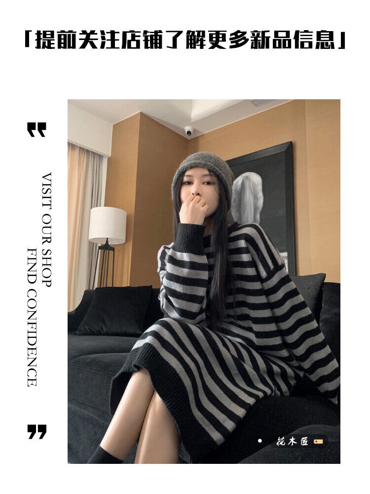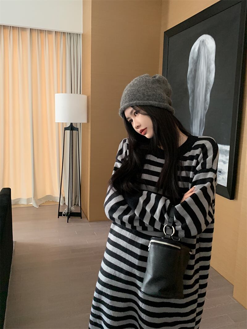ストライプニットドレス オータムルーズ薄手Aラインスカート 秋物 10/5 秋冬 オータム ウインター ナチュラル mi4689446654067