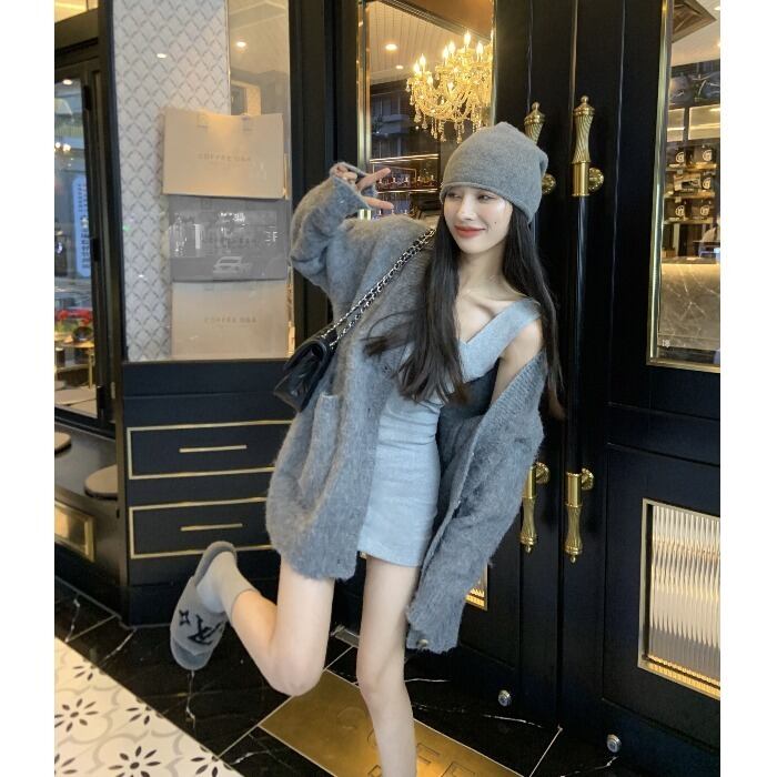Vネックグレーセーター コート オータムスタンダードカジュアルカーディガン ロング レトロ 秋物 10/5 秋冬 オータム ウインター ナチュラル mi465397010761