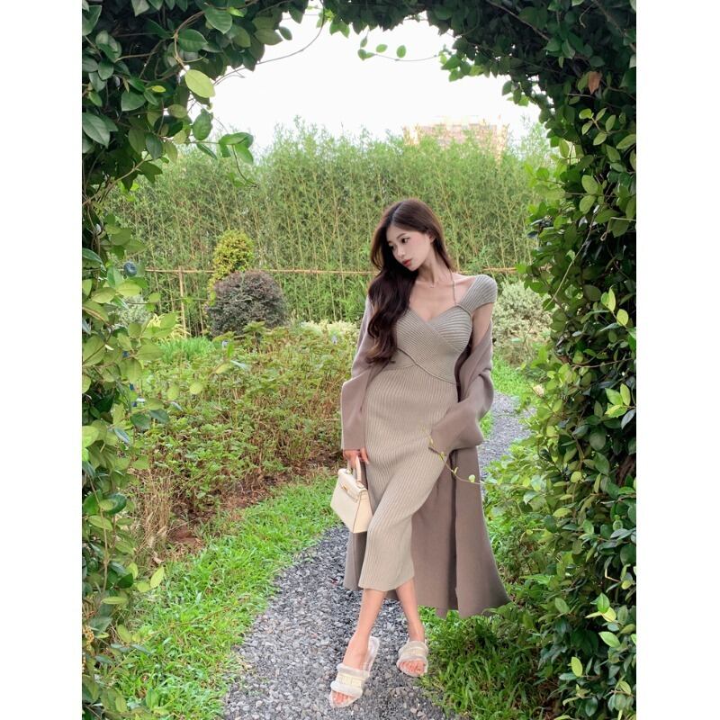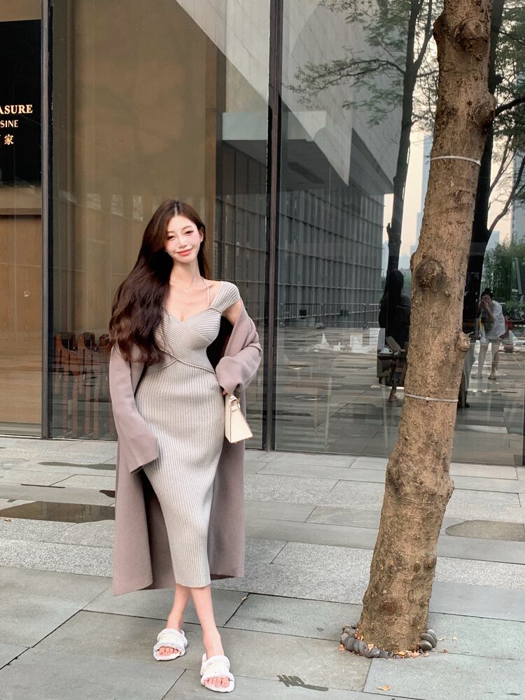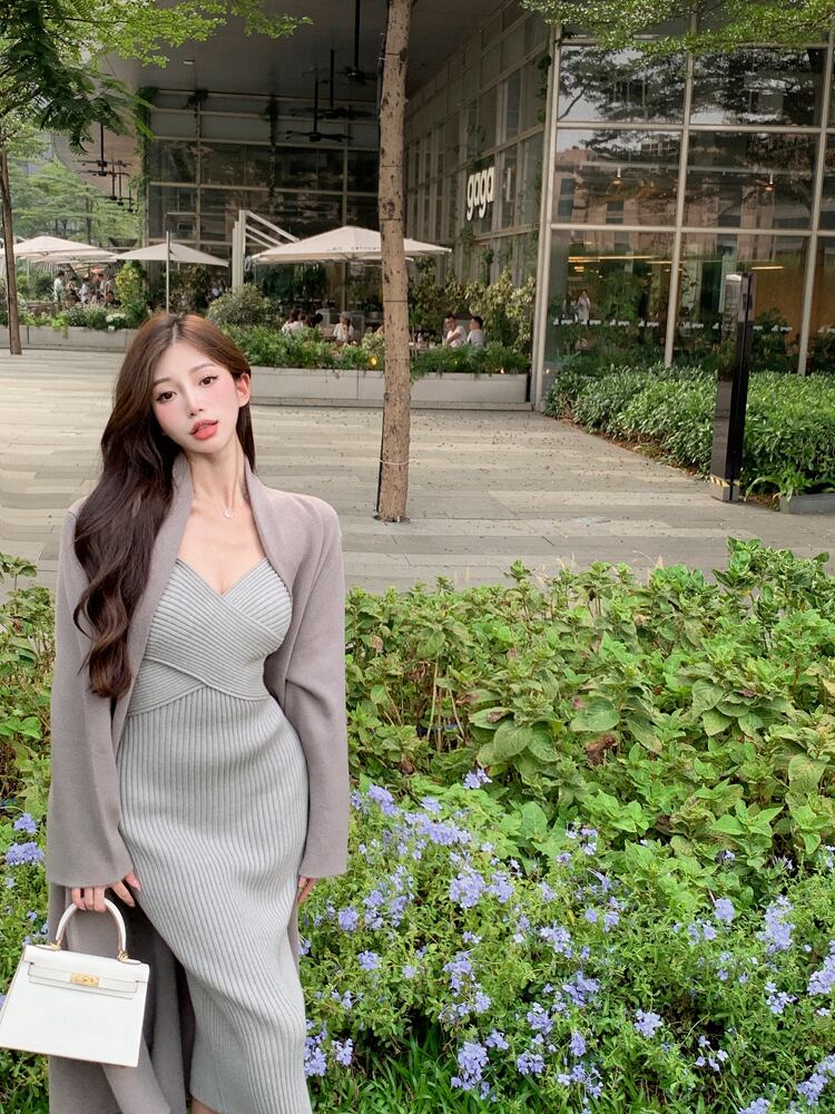 色:キャメルドレス,グレーコートシングルピース