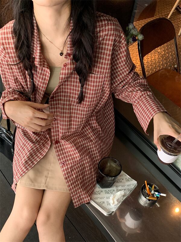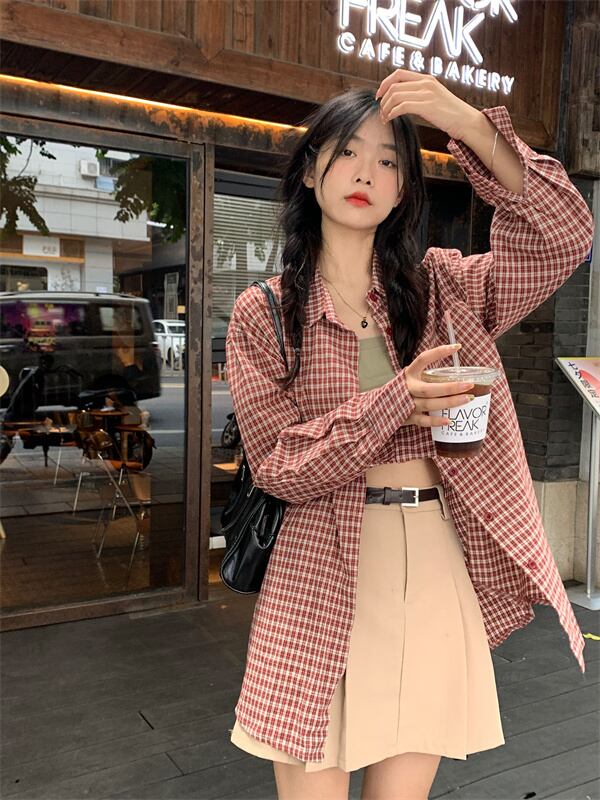 スタンダード薄手格子柄シャツ オータムルーズトップス ロング レトロ 秋物 10/5 秋冬 オータム ウインター ナチュラル mi4690379940915