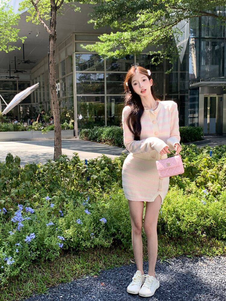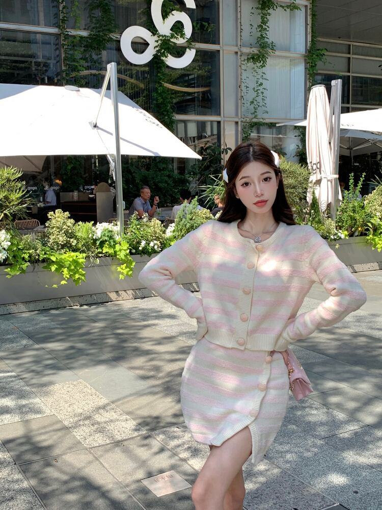 ストライプニットオータムカーディガンスカート ロング ピンク 大人ガーリー スウィート キュート カジュアル 秋物 10/5 秋冬 オータム ウインター ナチュラル mi4696929588899