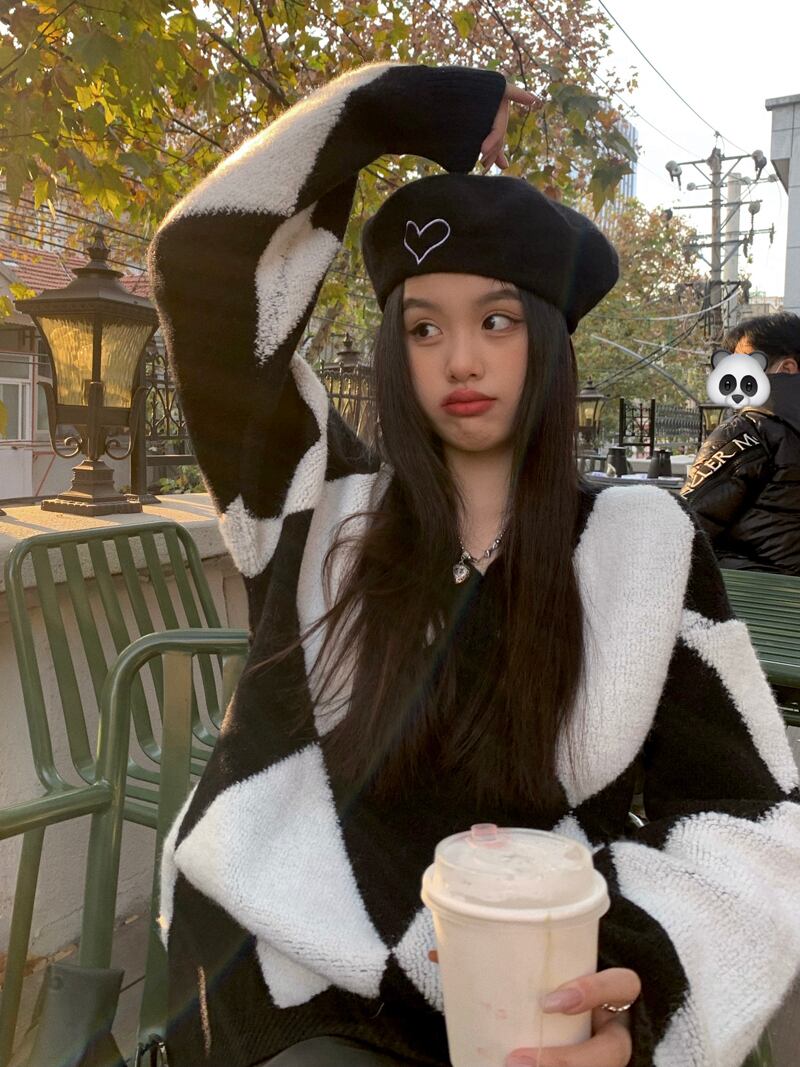 スタンダードブラックホワイトVネックプルオーバー セーター オータムルーズニットトップス レトロ 秋物 10/5 秋冬 オータム ウインター ナチュラル mi4667073995999