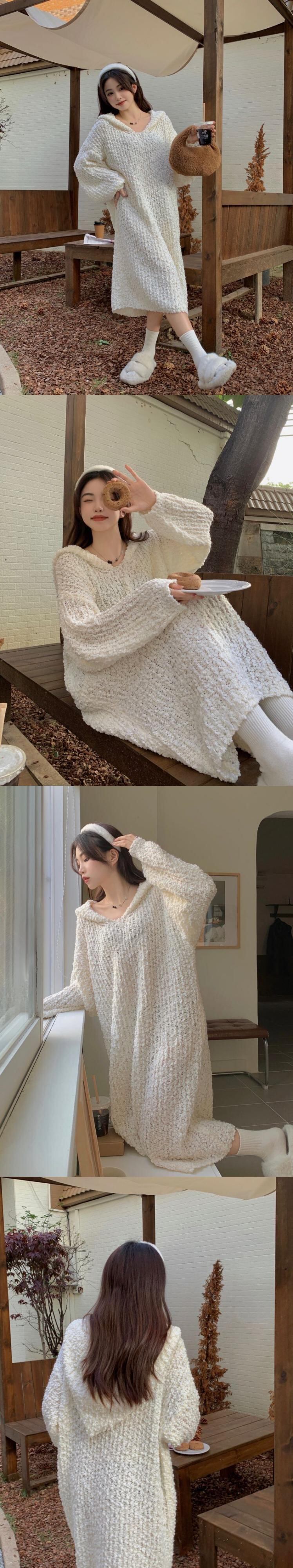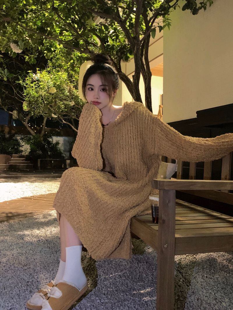 カジュアルソリッド カラーフードニットドレス オータムスタイルルーズ薄手Aラインスカート 秋物 ソリッドカラー 10/5 秋冬 オータム ウインター ナチュラル mi4636883152649