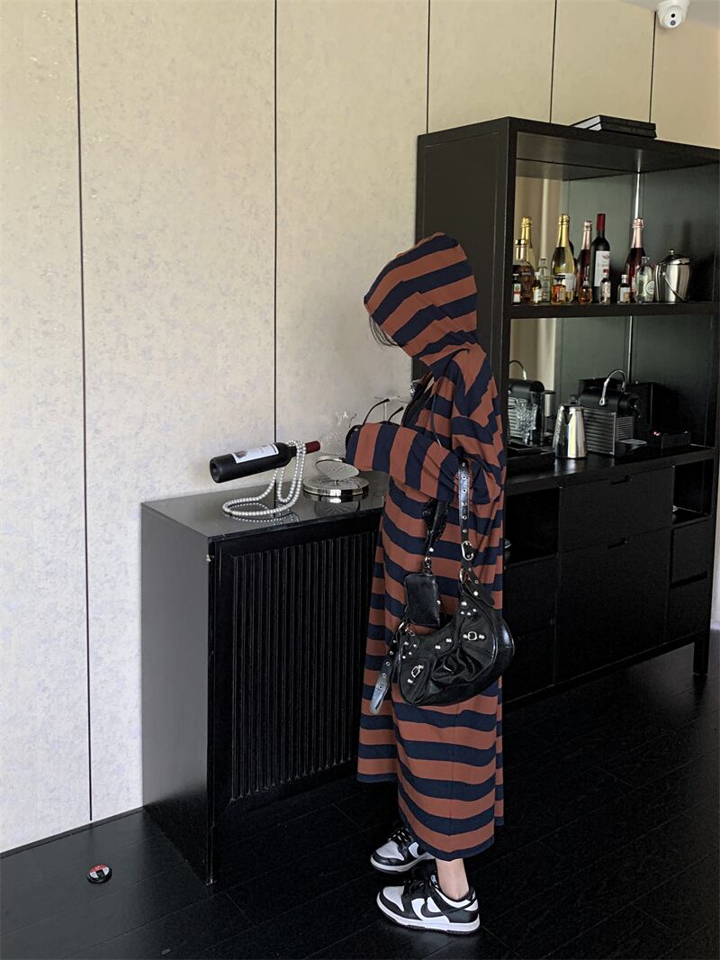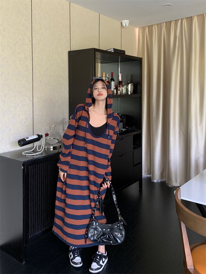 フードストライプニットドレス オータムカジュアルルーズAラインスカート 秋物 10/5 秋冬 オータム ウインター ナチュラル mi4639287076115