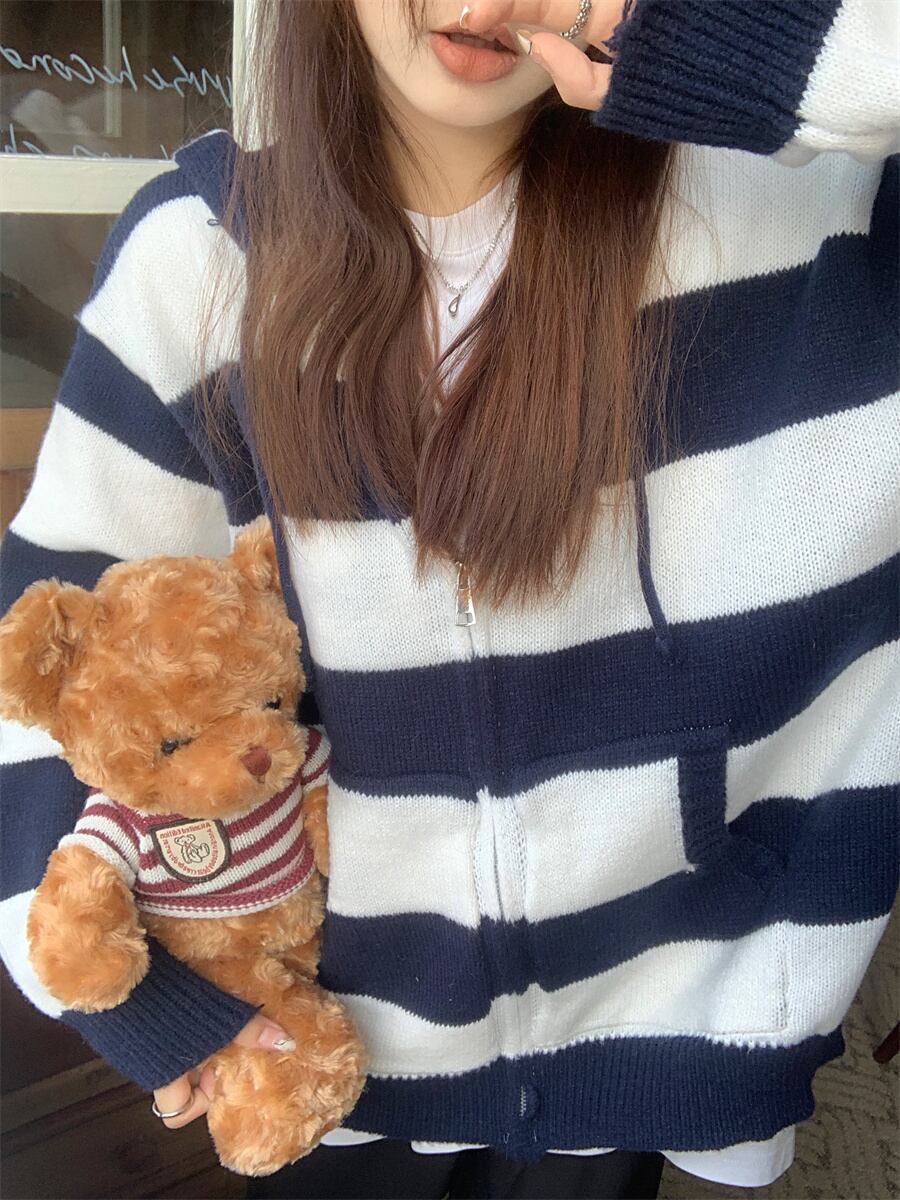 スタイルストライプフードセーター コート オータムカジュアルルーズトップス 秋物 10/5 秋冬 オータム ウインター ナチュラル mi4676194469055