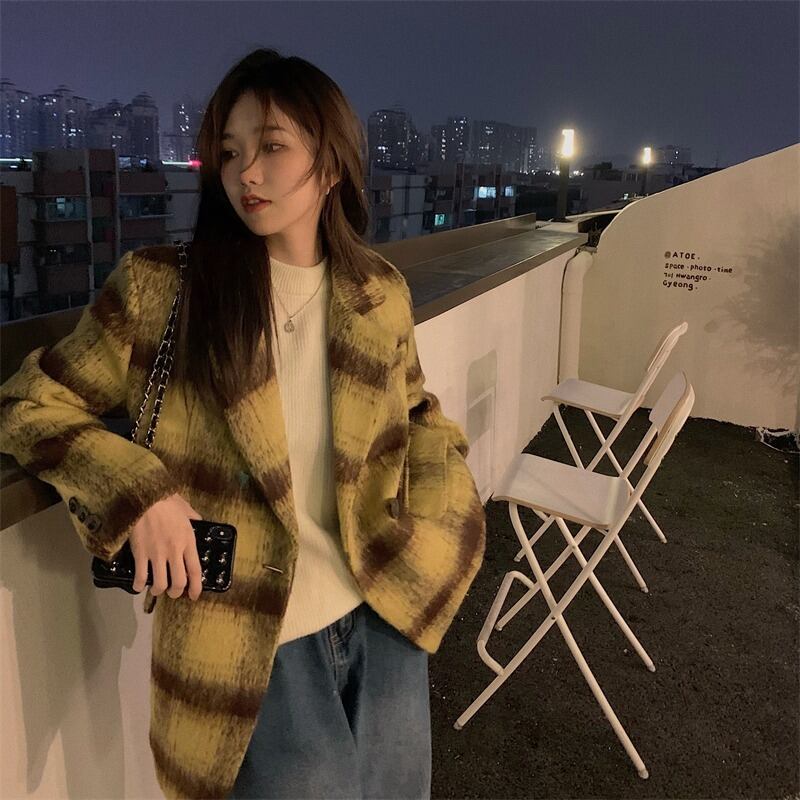 カラー格子柄ジャケット オータムスタンダードコート ロング レトロ 秋物 10/5 秋冬 オータム ウインター ナチュラル mi4616122758664