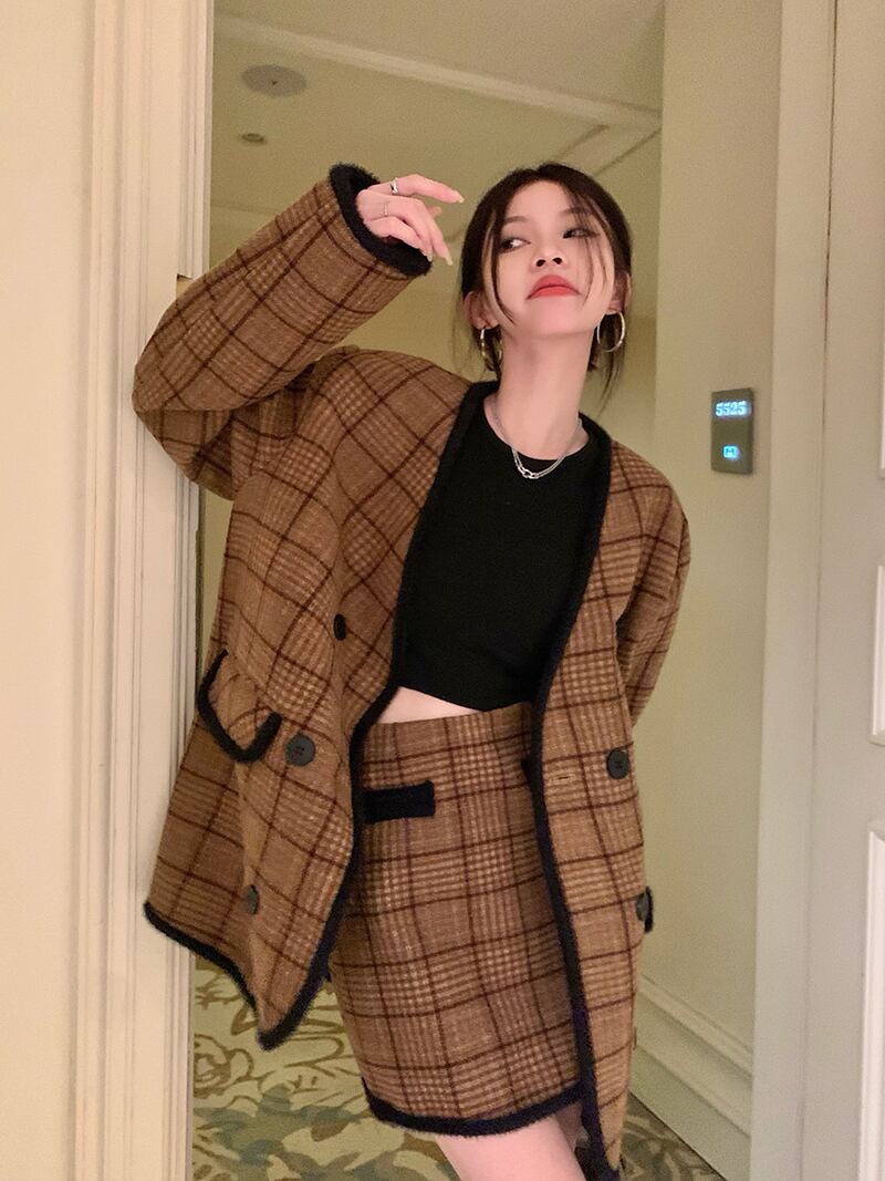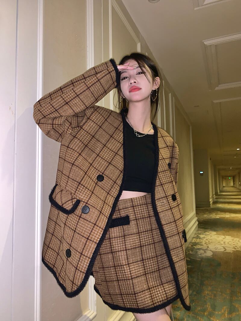 色:格子縞のジャケットのシングルピース,格子縞のスカートワンピース