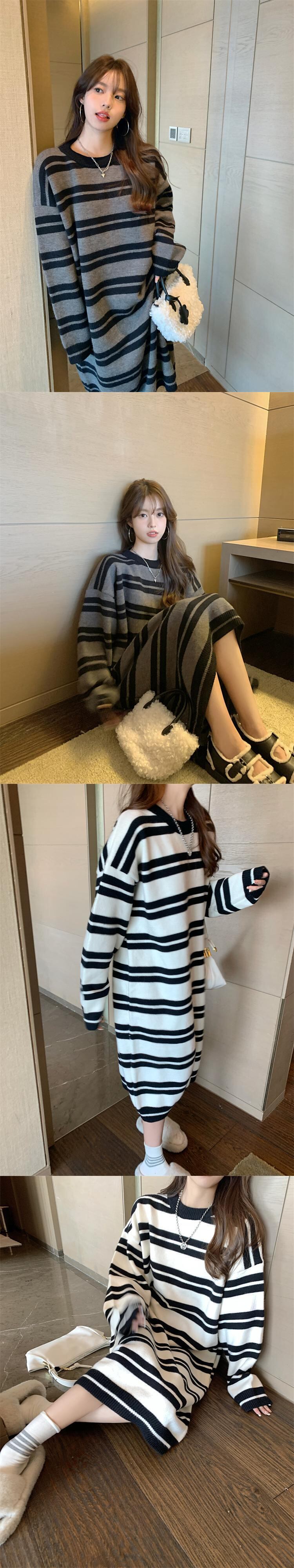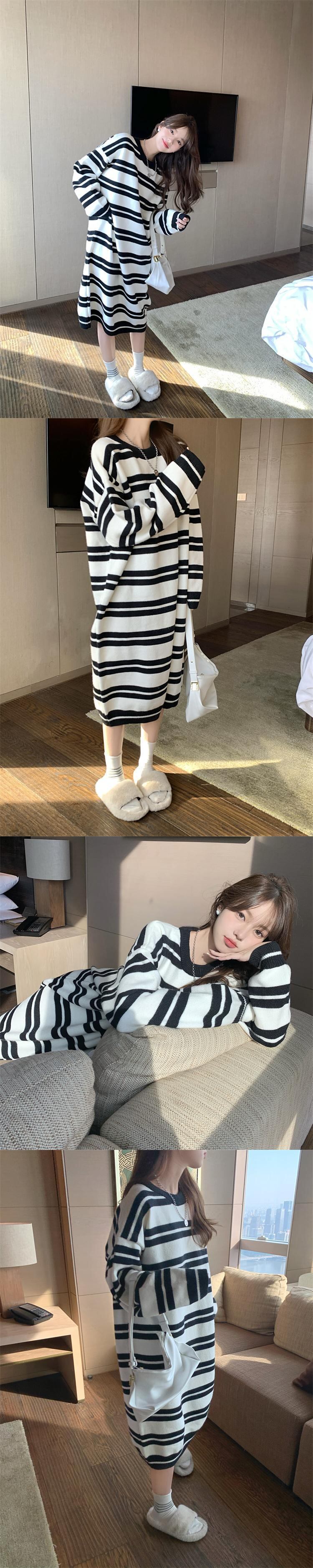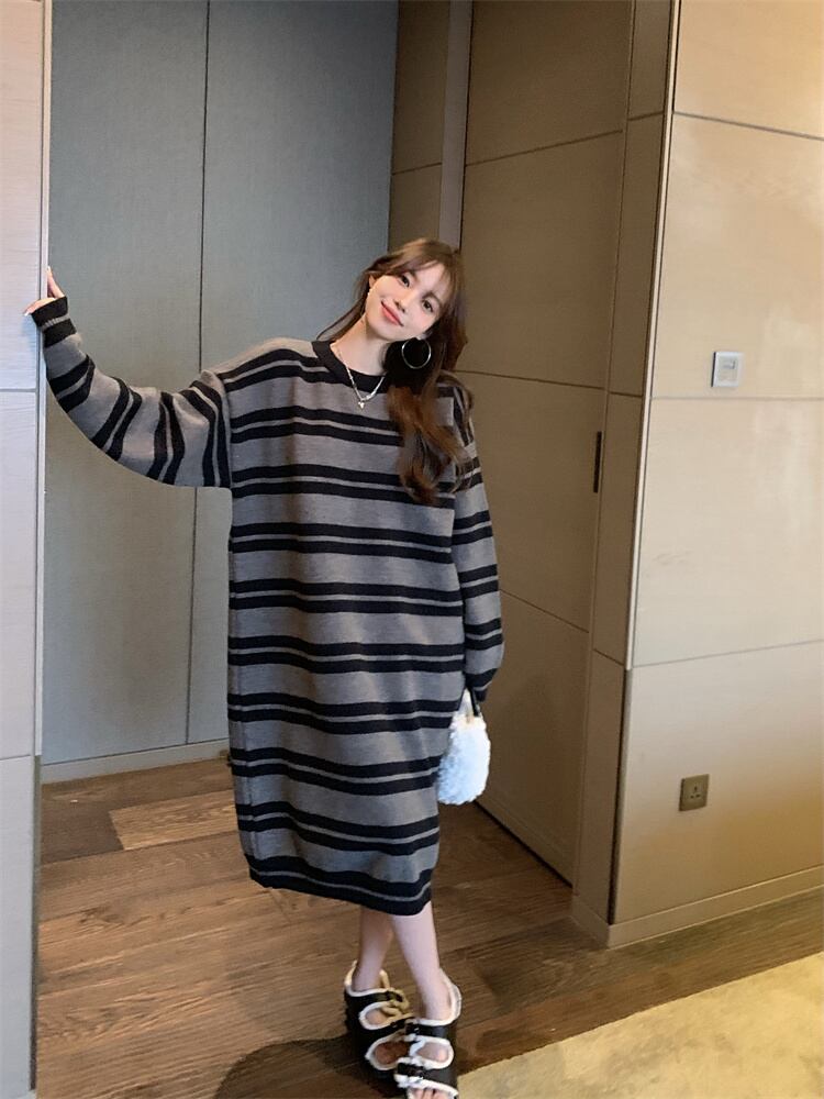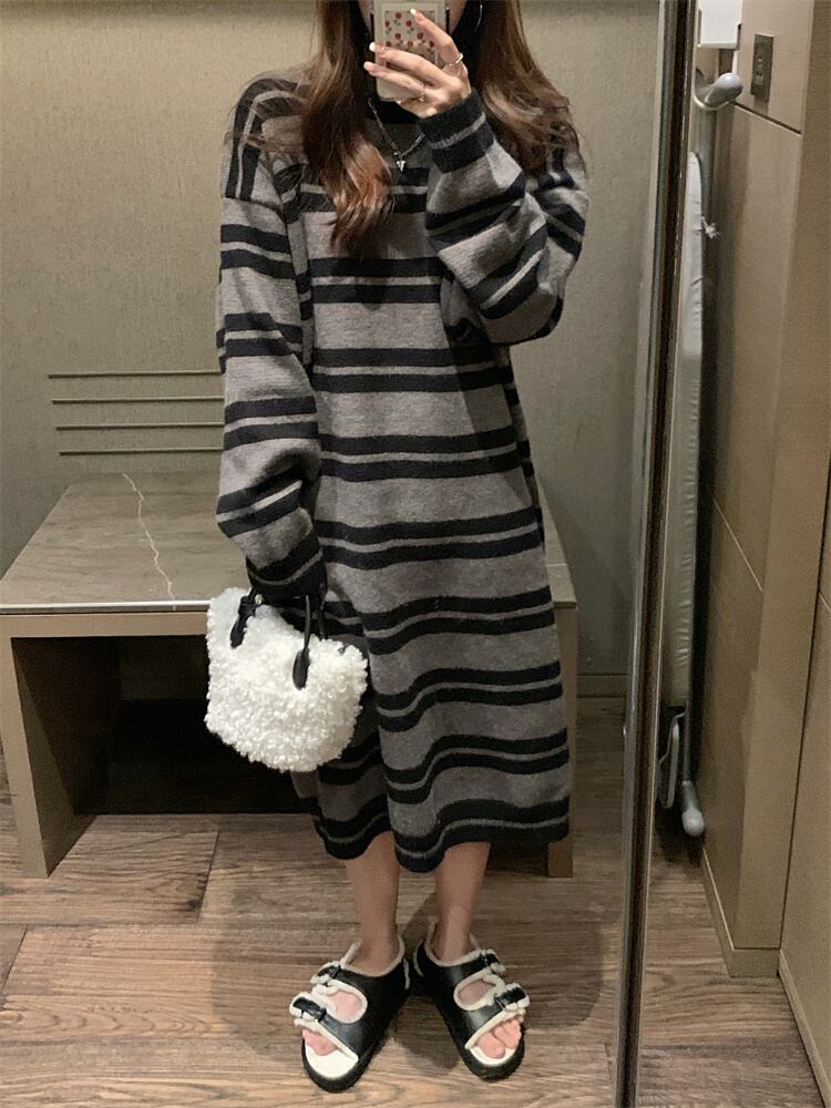 スタイルストライプルーズニットドレス オータムミディスカート ロング 秋物 10/5 秋冬 オータム ウインター ナチュラル mi4686451191349