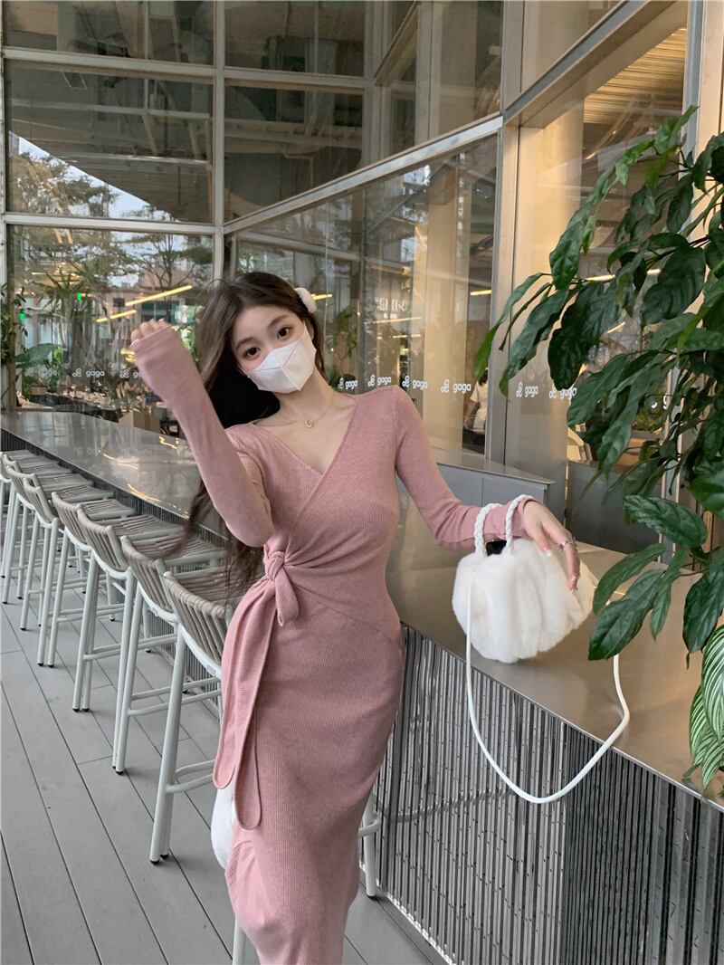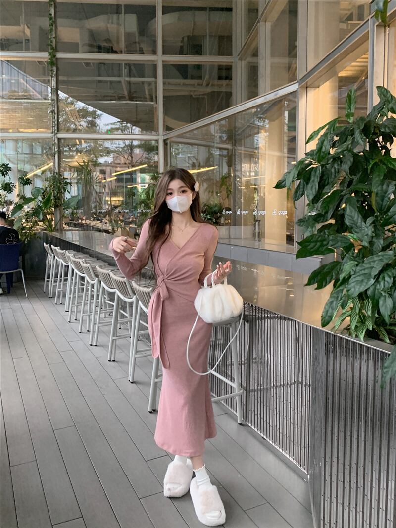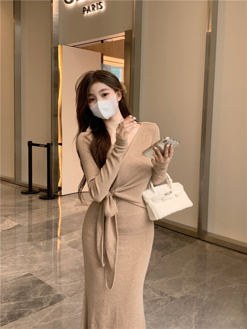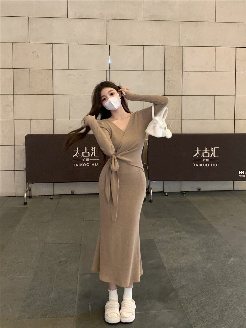 Vネックスリムドレス オータムニットスカート ロング 秋物 10/5 秋冬 オータム ウインター ナチュラル mi4631352119617