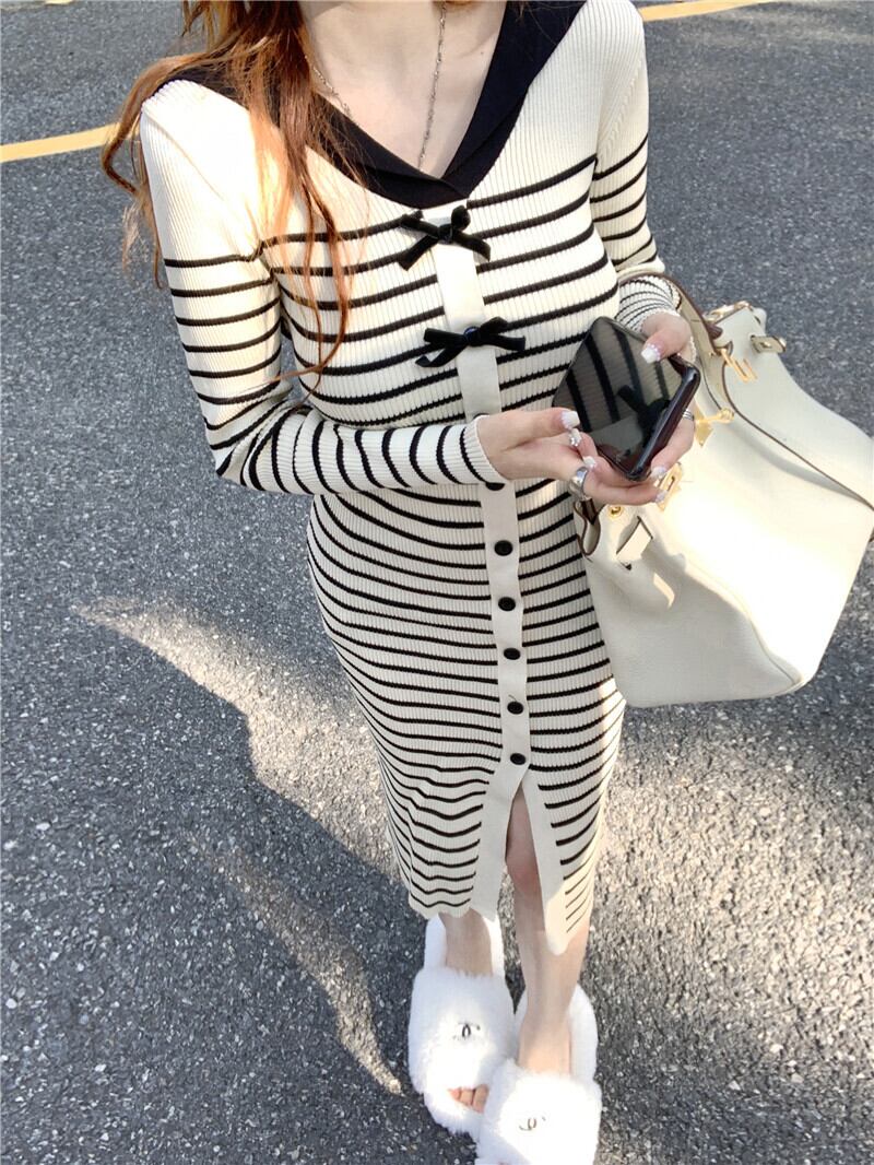 長袖スリーブニットドレス オータムウィンタースカート ストライプスリムフィット ロング 秋物 冬物 10/5 秋冬 オータム ウインター ナチュラル mi4642040416396
