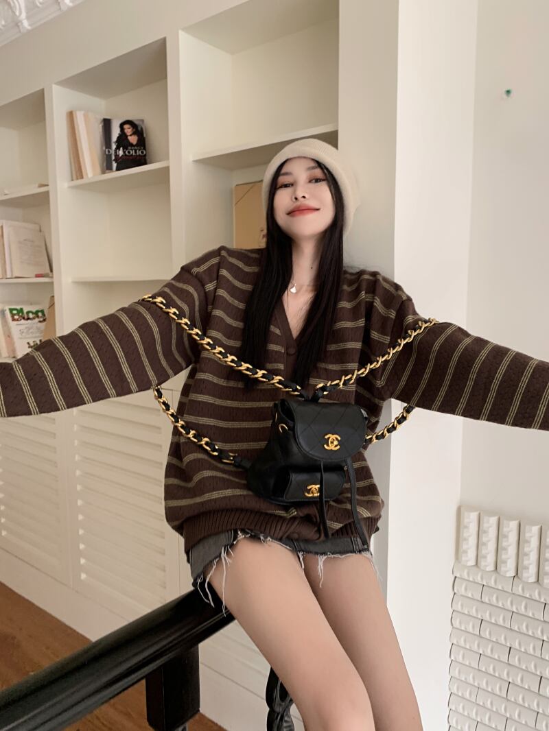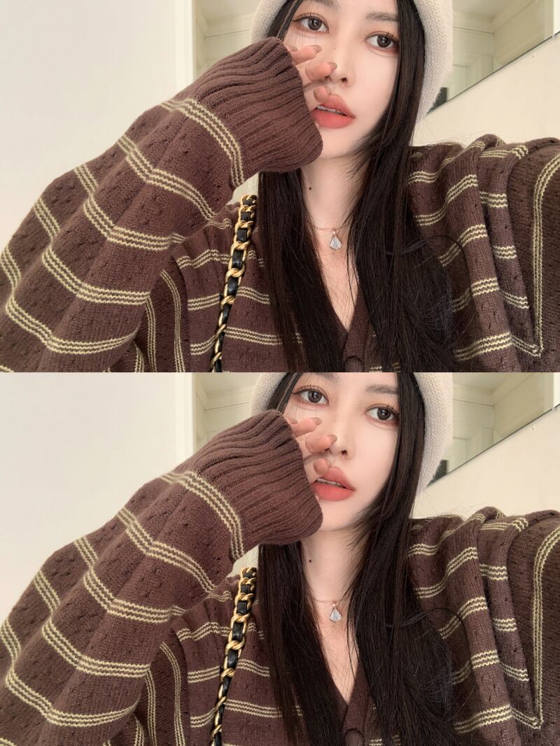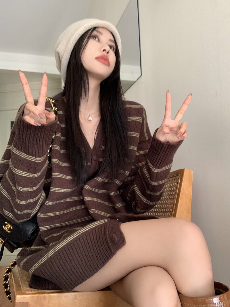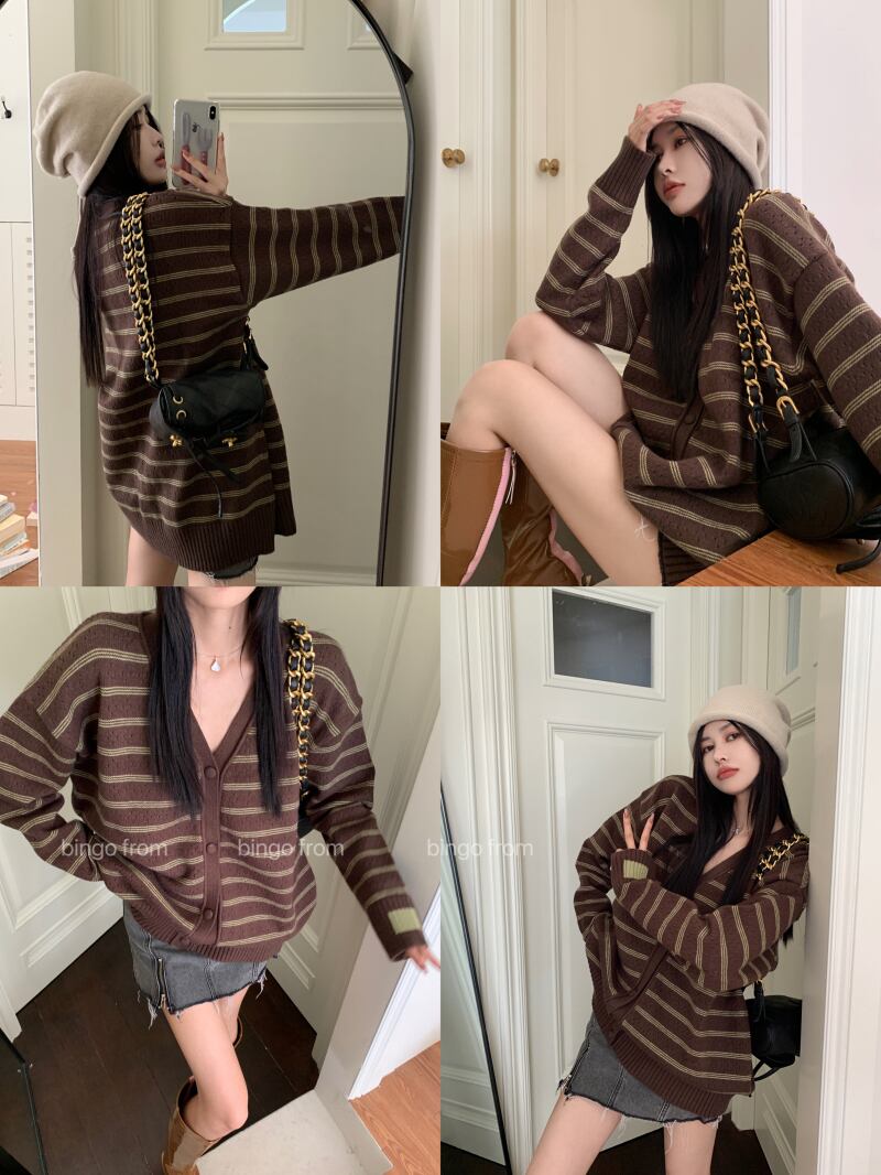 スタンダードスタイルカラーストライプVネックセーター コート オータムルーズニットカーディガントップス レトロ 秋物 10/5 秋冬 オータム ウインター ナチュラル mi4690170387978