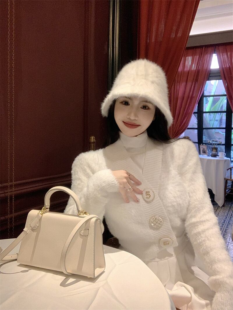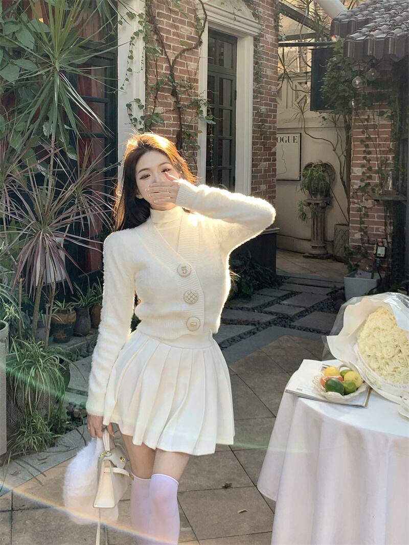 色:ホワイトボトミングシャツ,黒底シャツ,白いプリーツスカート,ブラックプリーツスカート,大きなボタンの白いカーディガン,ビッグボタンブラックカーディガン