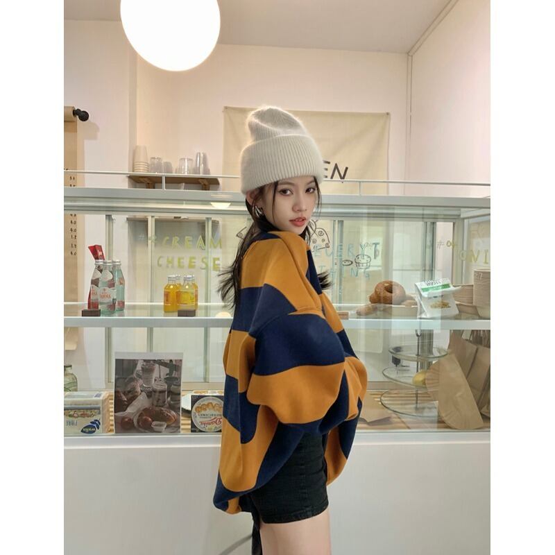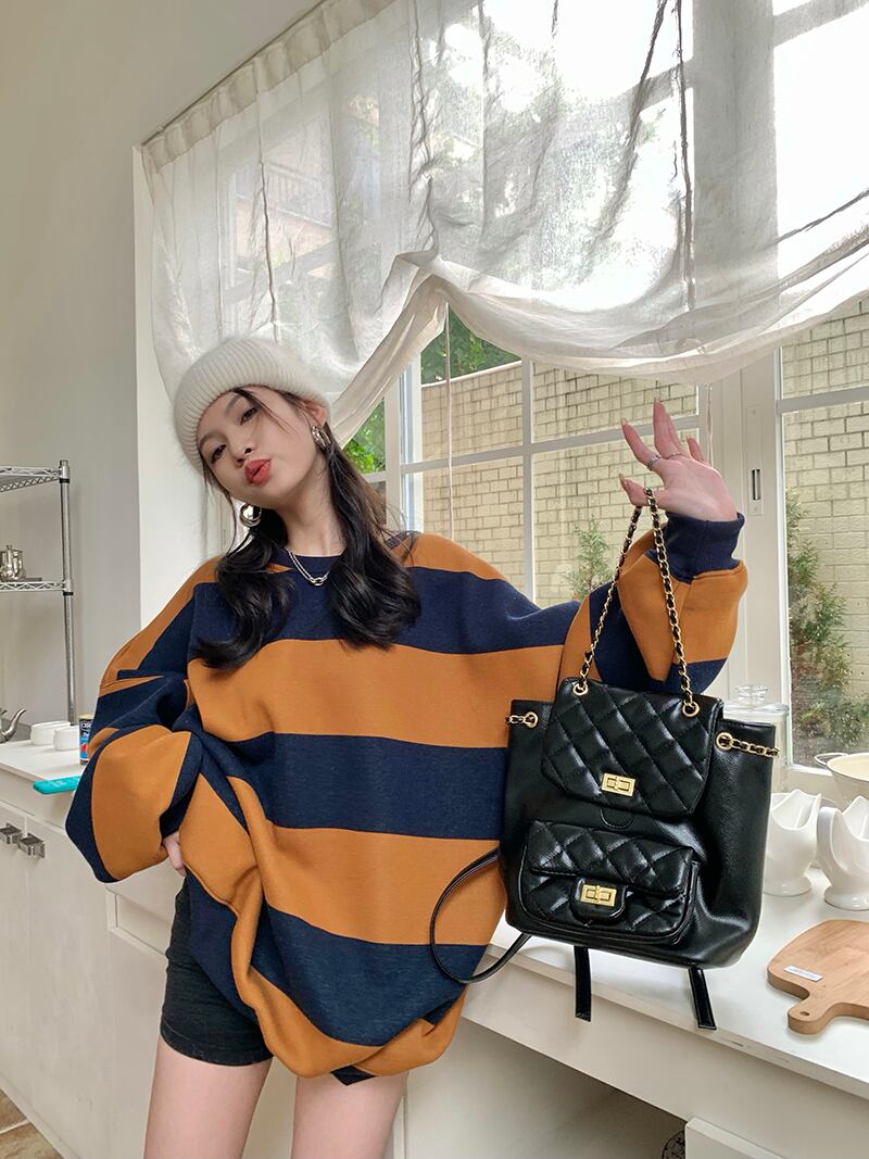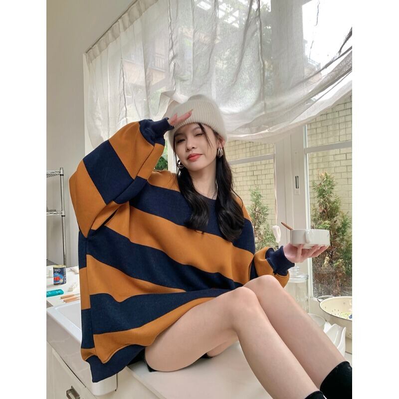 ストライプセーター オータムルーズラウンドネックトップス ロング 秋物 Oネック 10/5 秋冬 オータム ウインター ナチュラル mi4657586505344