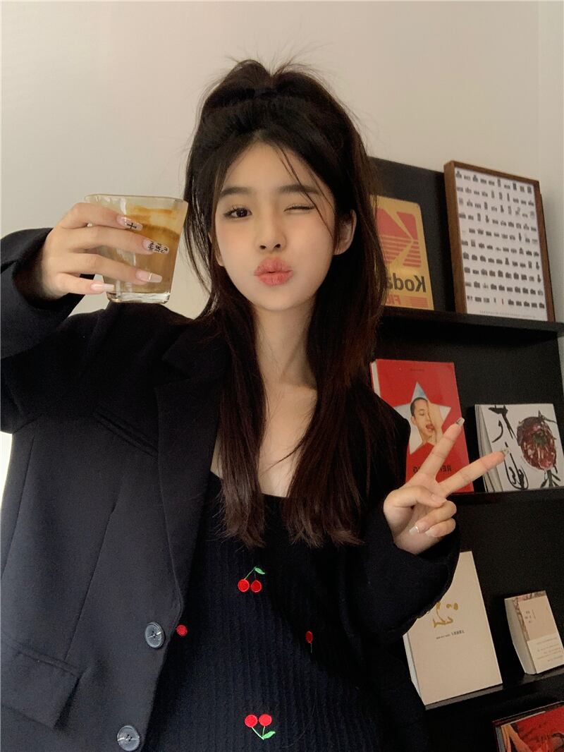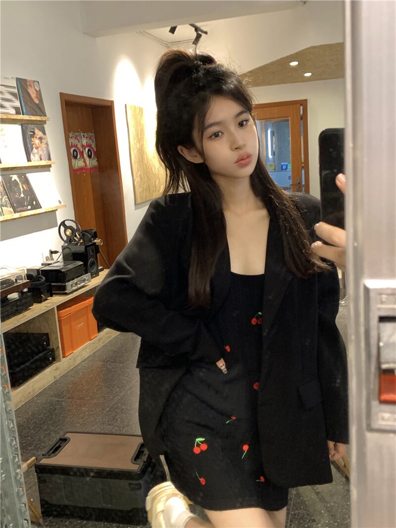色:黒いスーツのワンピース,ブラックサスペンダースカート