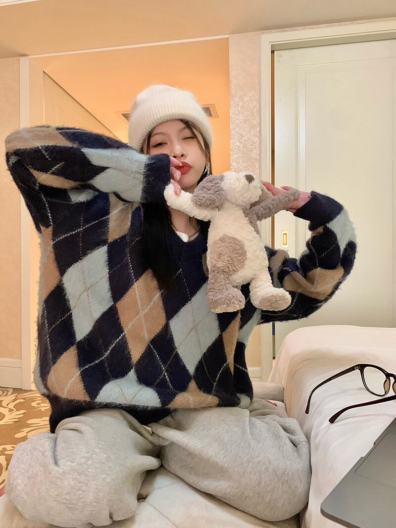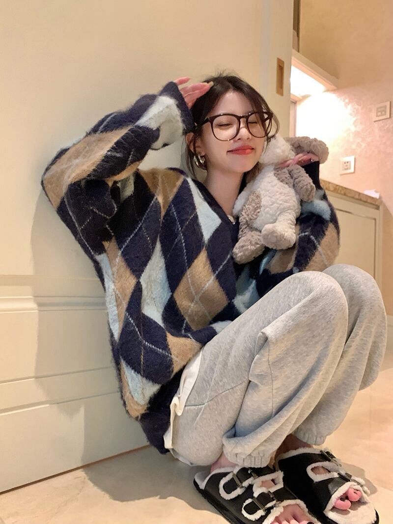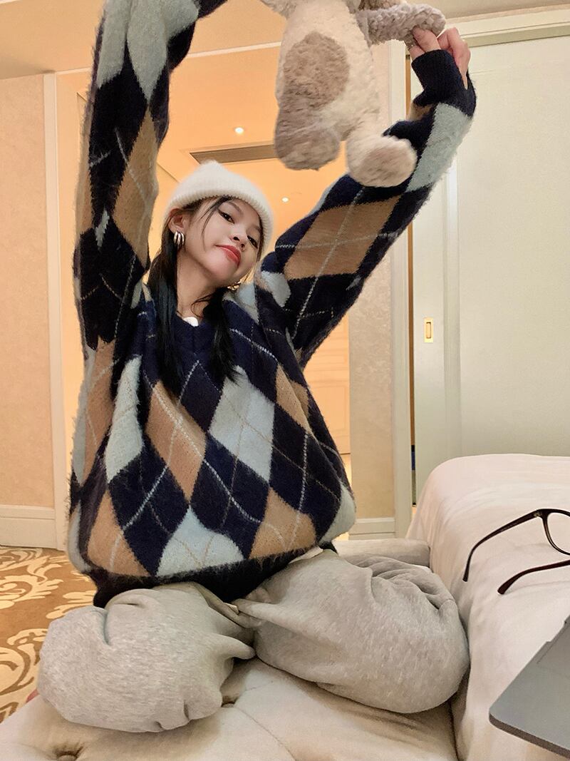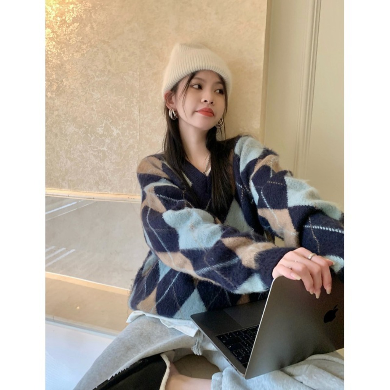 ブルーVネックプルオーバー セーター オータムルーズニットトップス 秋物 10/5 秋冬 オータム ウインター ナチュラル mi4612959712932