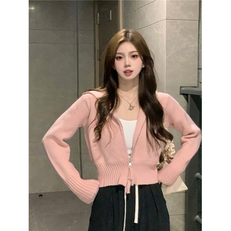 フードショートセーター コート オータムダブルジッパーカーディガントップス ピンク 秋物 10/5 秋冬 オータム ウインター ナチュラル mi462716070072