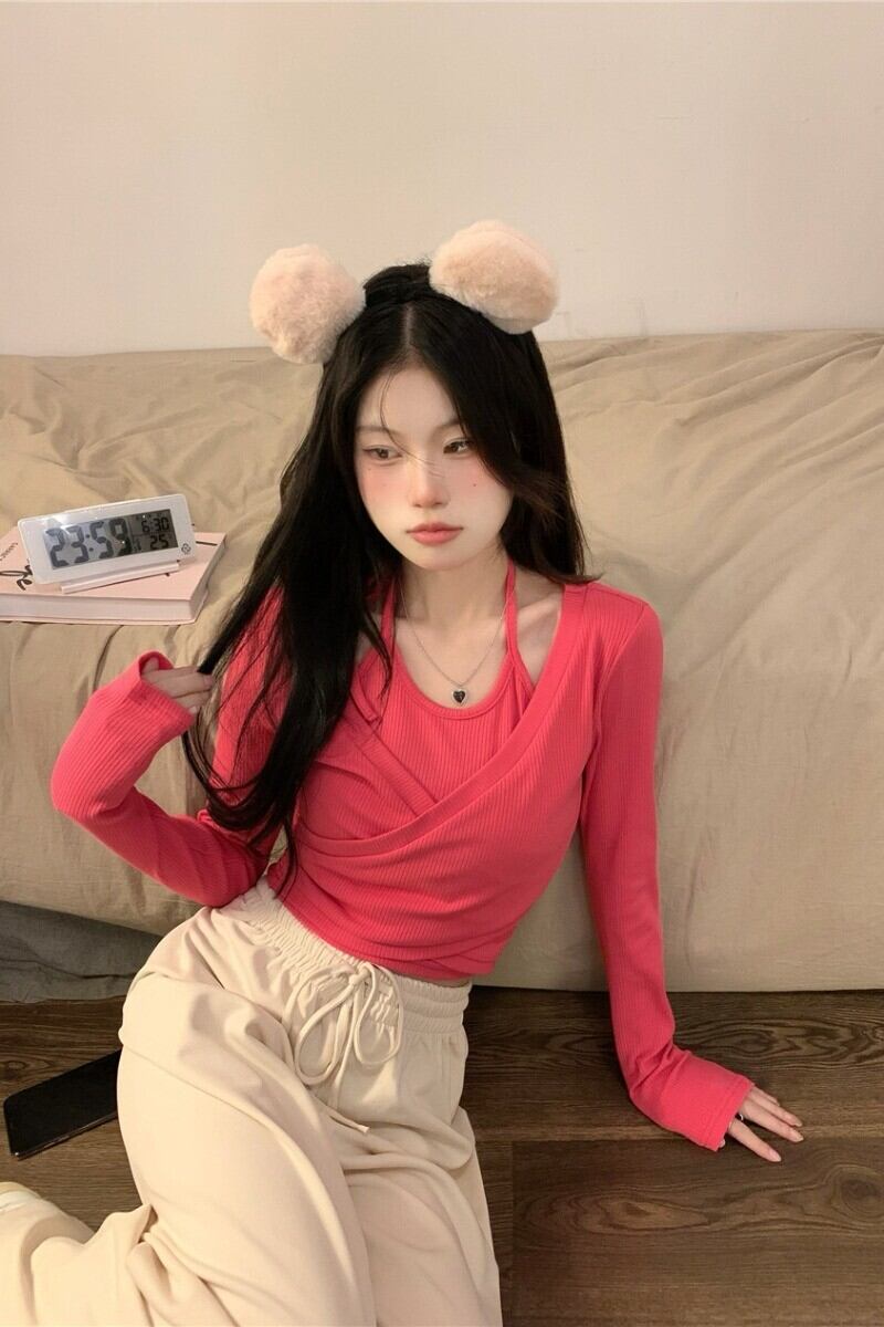 色:ローズレッドトップ単品,ベージュのワンピースパンツ