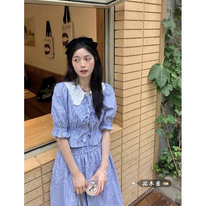ストライプサマーカラーシャツ ハイウェストウェストAラインスカート セット 大人ガーリー スウィート キュート カジュアル 夏物 10/5 秋冬 オータム ウインター ナチュラル mi464670787648