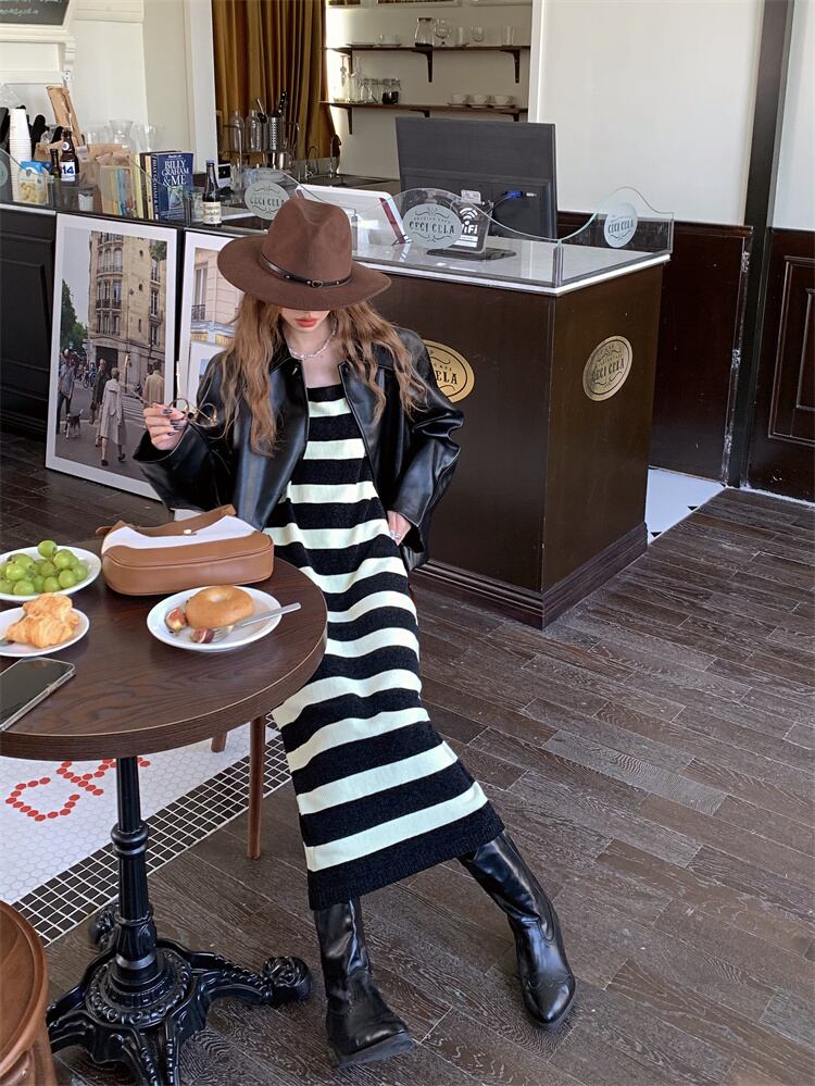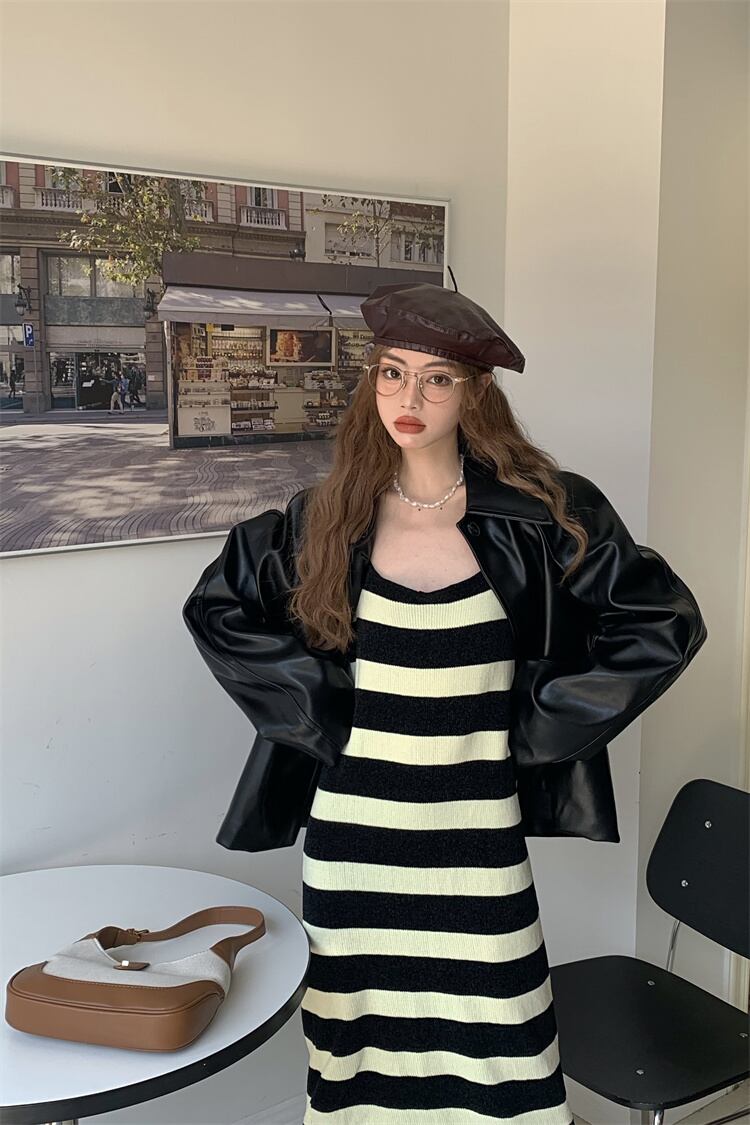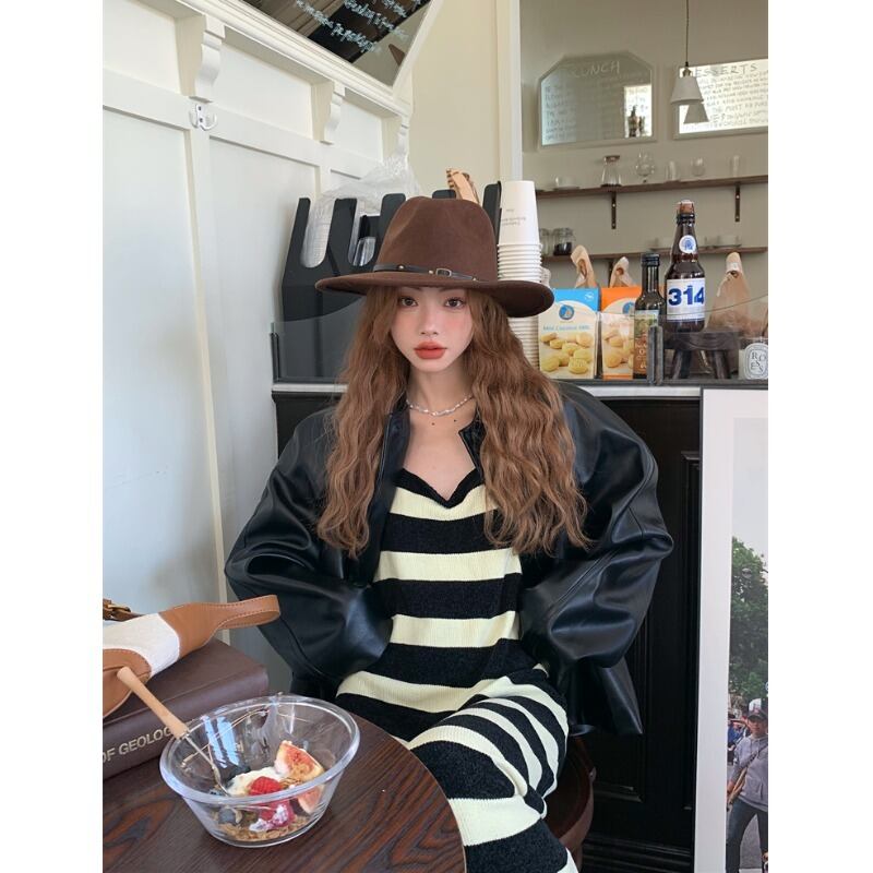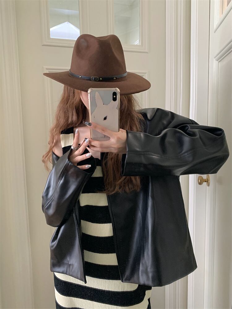 スタンダードブラックカラーレザージャケット オータムルーズトップス ロング レトロ 秋物 10/5 秋冬 オータム ウインター ナチュラル mi4637947678772