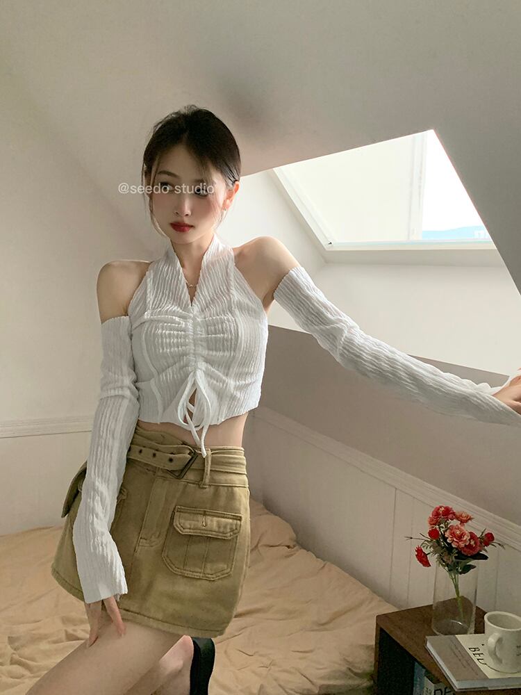 ストラップレスブラックホルターサマーギャザーショートトップス 夏物 10/5 秋冬 オータム ウインター ナチュラル mi4635379213078