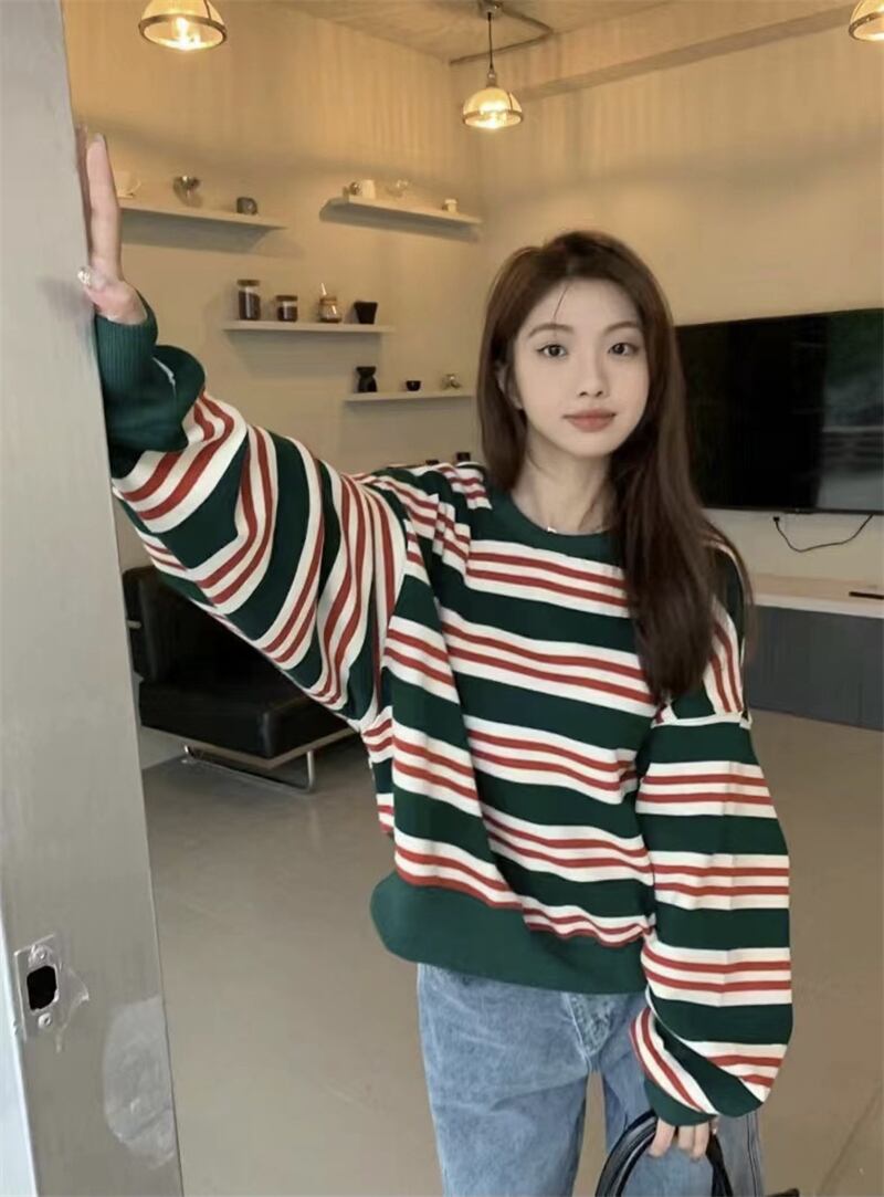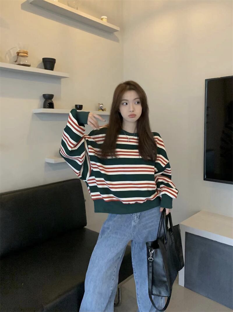 スタイルスタンダードストライプラウンドネックセーター オータムルーズトップス レトロ ストリート 秋物 Oネック 10/5 秋冬 オータム ウインター ナチュラル mi4689841140994