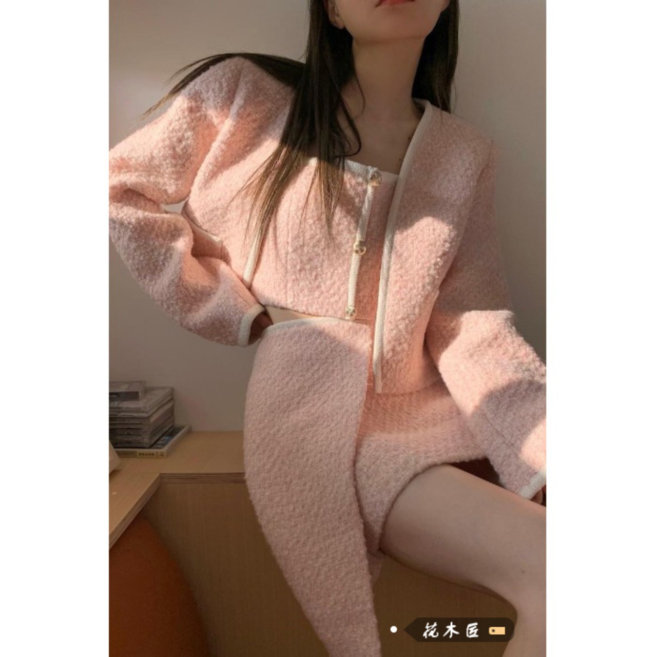 色:ピンクのジャケット一枚,ピンクのスリングワンピース,ピンクショートスカートワンピース