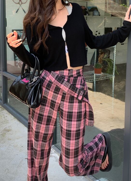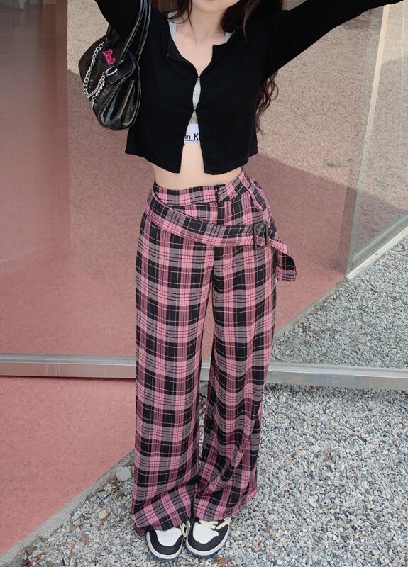格子柄パンツ オータムハイウェストウェストワイドレッグルーズカジュアル ピンク 秋物 ワイドパンツ 10/5 秋冬 オータム ウインター ナチュラル mi4698076022015