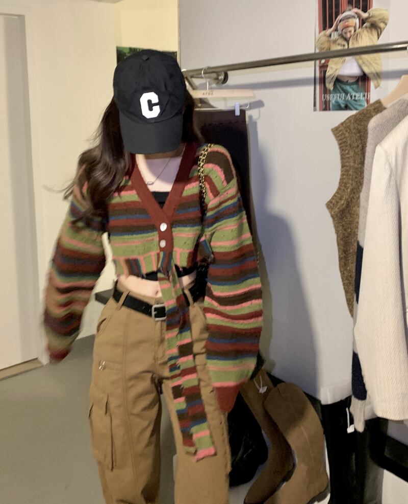 スタンダードカラーストライプセーター ジャケット オータムVネックニットカーディガン レトロ 秋物 10/5 秋冬 オータム ウインター ナチュラル mi4656721484620