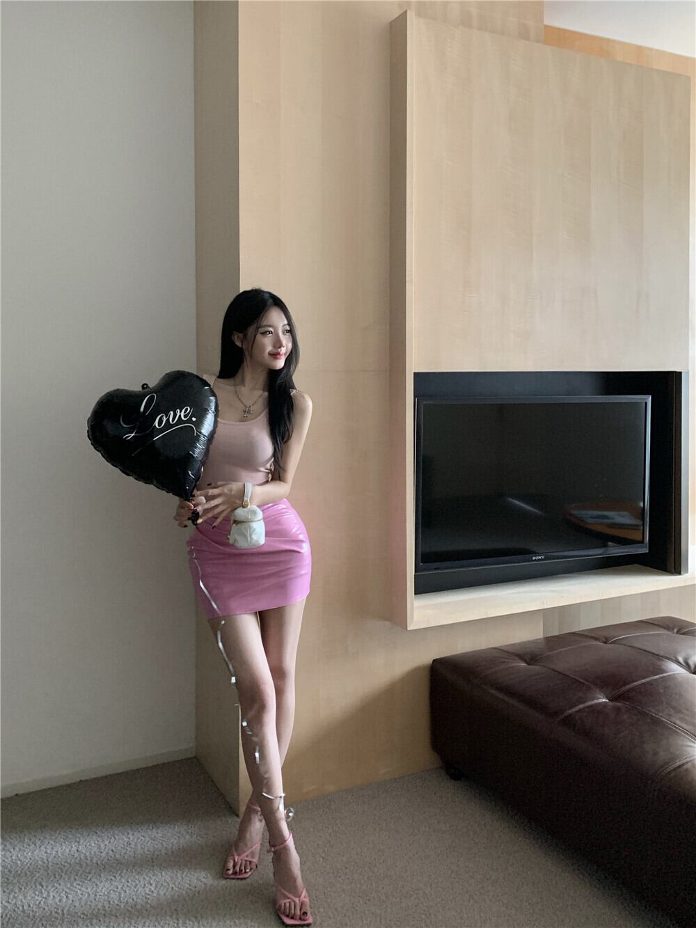 色:ピンクのスリングワンピース,ピンクのレザースカートシングルピース