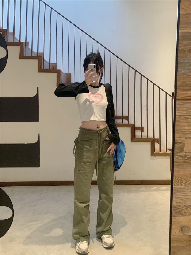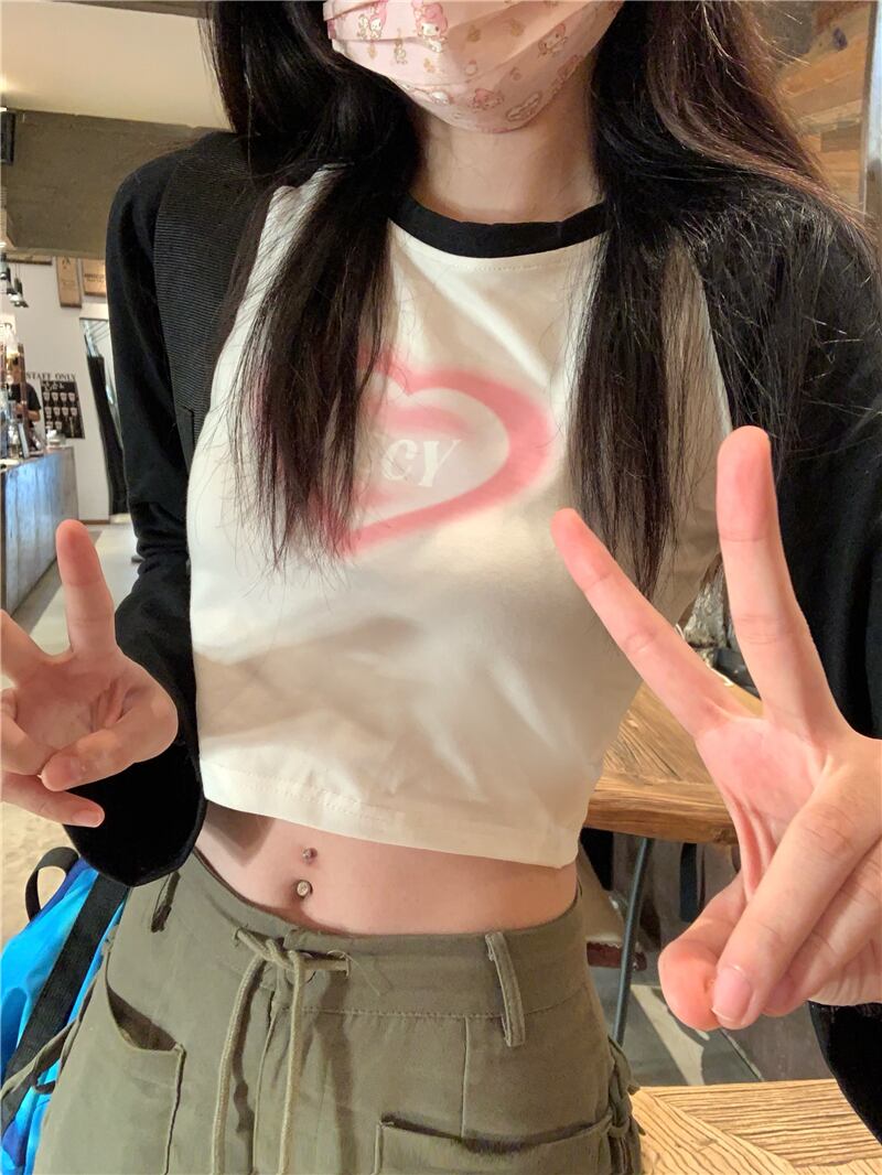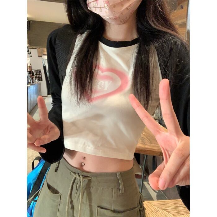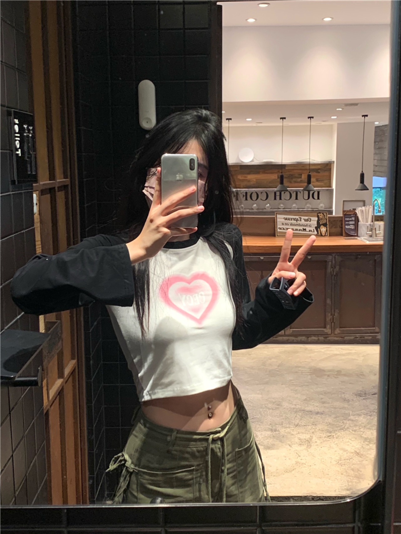 プリント柄カラーTシャツ オータムスタイルスリムショートトップス ロング 秋物 10/5 秋冬 オータム ウインター ナチュラル mi4693033795792