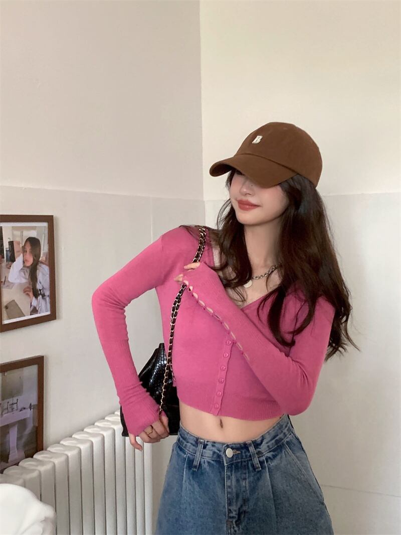 オータムソリッド カラーVネックセーター スリムショートカーディガントップス 秋物 ソリッドカラー 10/5 秋冬 オータム ウインター ナチュラル mi4617112254666