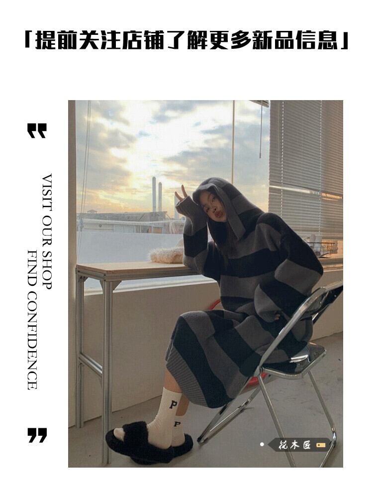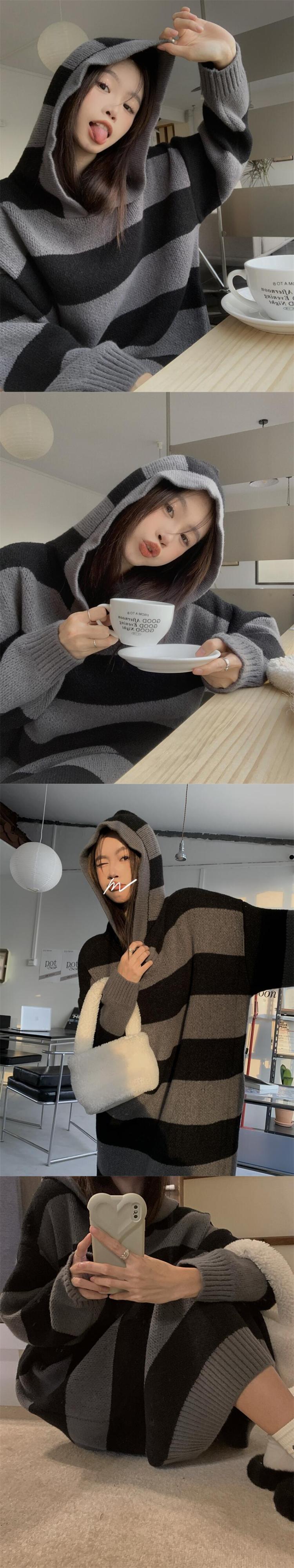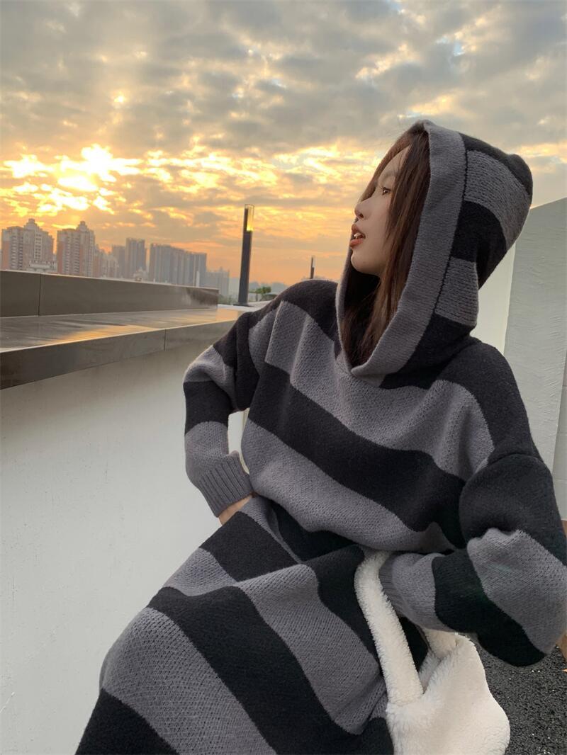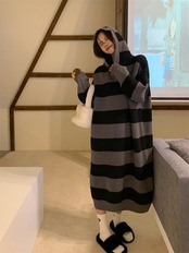 ルーズカラーストライプロングフードドレス オータムニットセーター 秋物 10/5 秋冬 オータム ウインター ナチュラル mi4681138611072