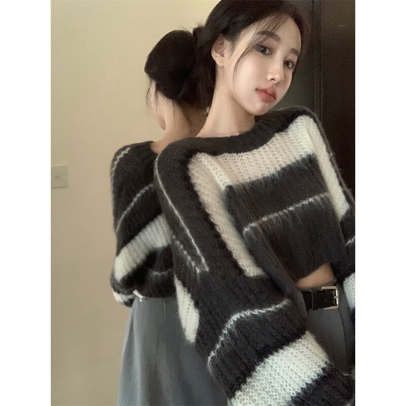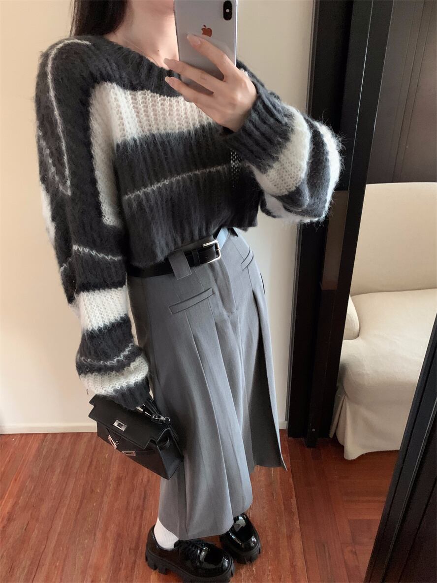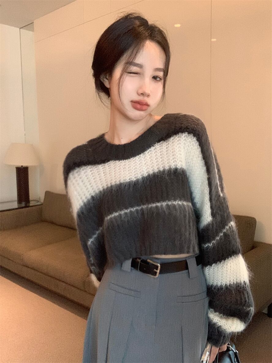 ストライプセーター オータムルーズショートトップス 秋物 10/5 秋冬 オータム ウインター ナチュラル mi4629146358708