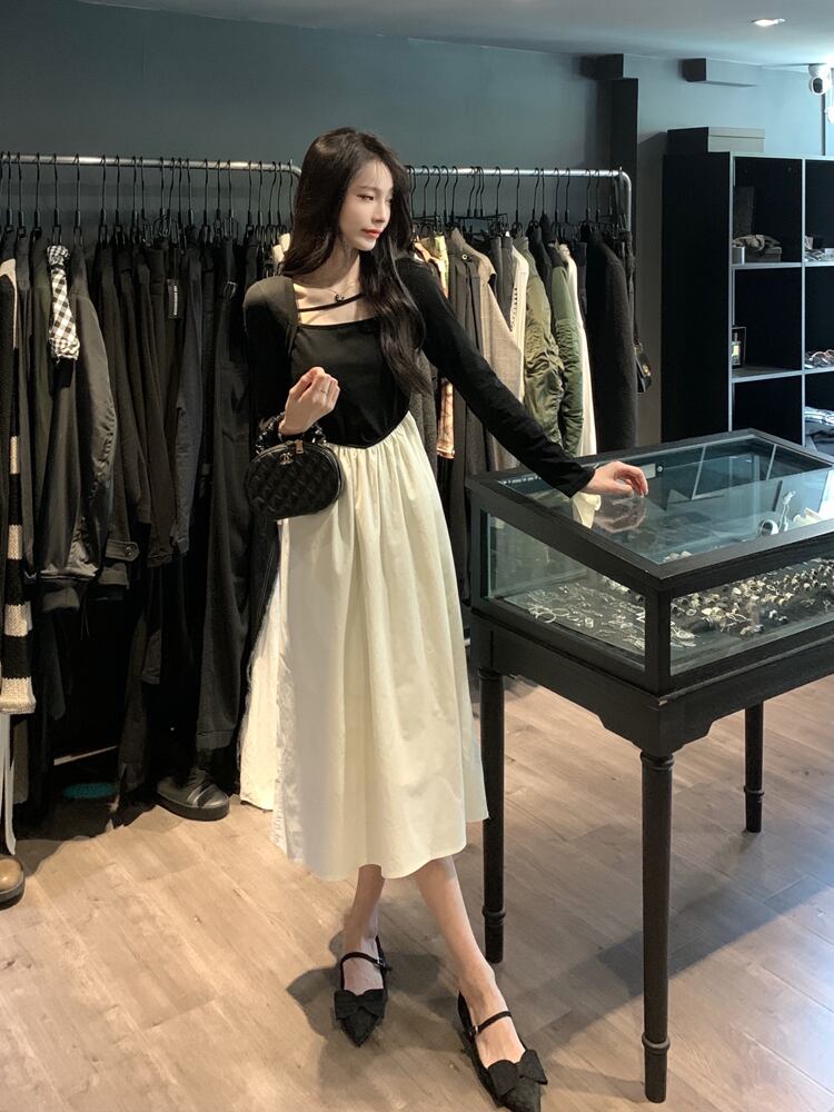 スタンダードカラードレス オータムウェストAラインスカート ロング レトロ 秋物 スクウェア 10/5 秋冬 オータム ウインター ナチュラル mi4656337841700