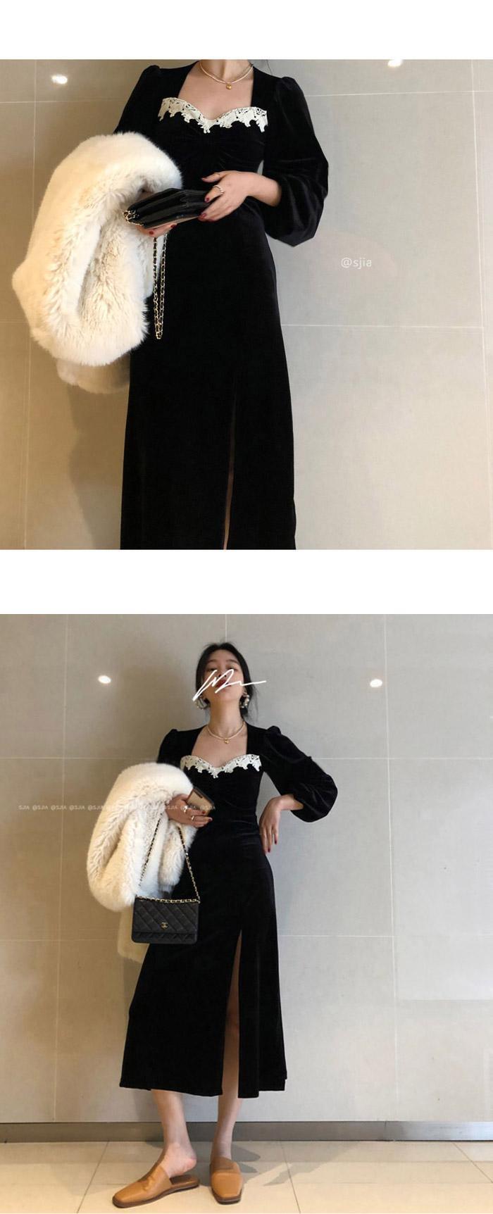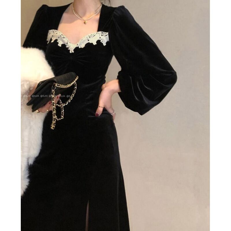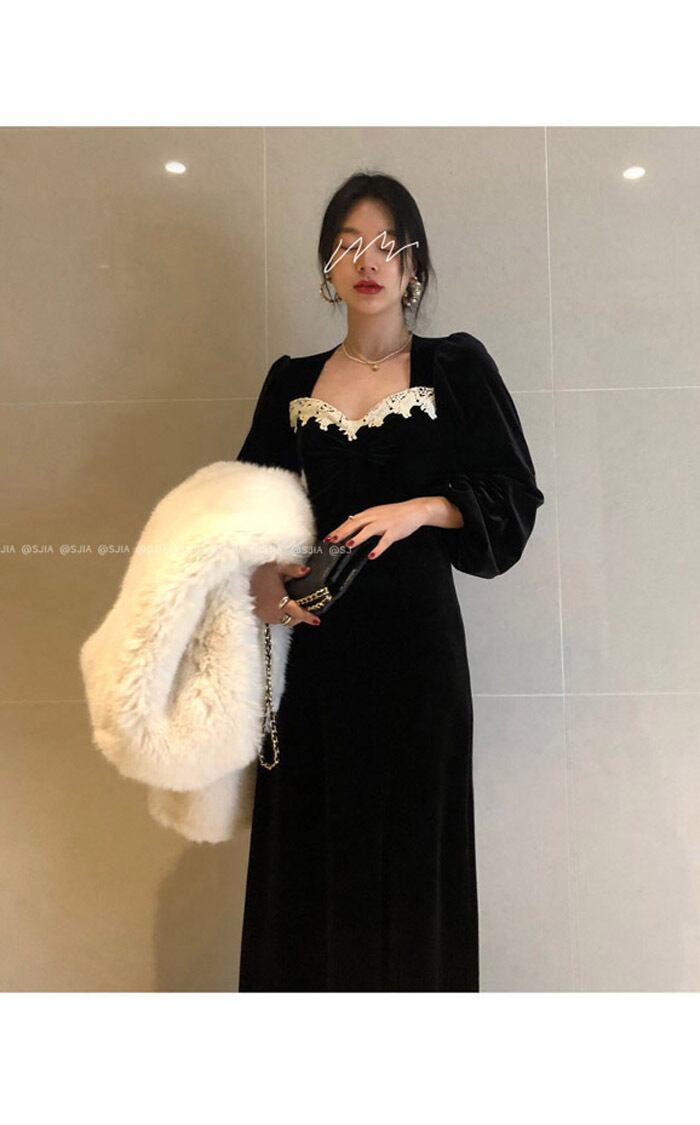 スタイルレースVネックドレス オータムベルベットスリムスカート ロング 秋物 10/5 秋冬 オータム ウインター ナチュラル mi4655630937246