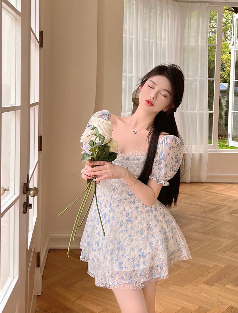 ブルーレースフローラルドレス サマーカラーウェストAラインスカート 夏物 花柄 ピュア スクウェア 10/5 秋冬 オータム ウインター ナチュラル mi4653214146281