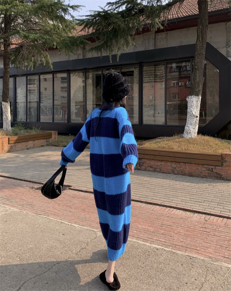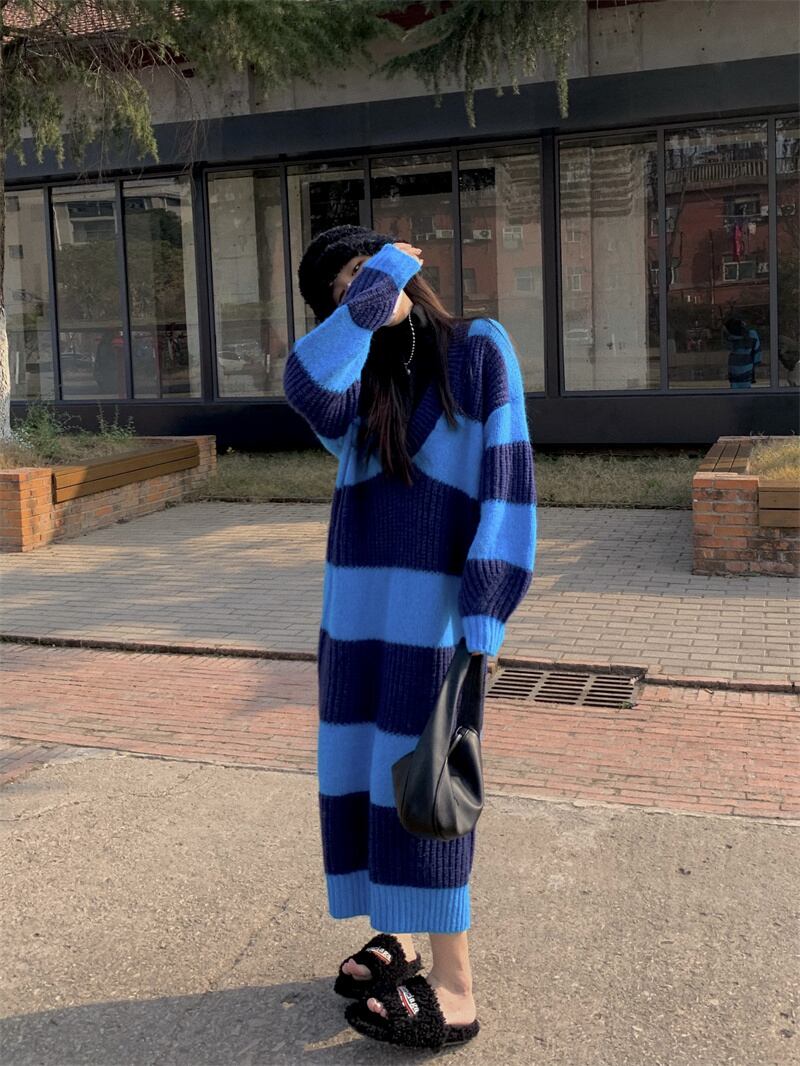 カジュアルストライプVネックドレス オータムルーズニットロングスカート 秋物 10/5 秋冬 オータム ウインター ナチュラル mi4636323445882