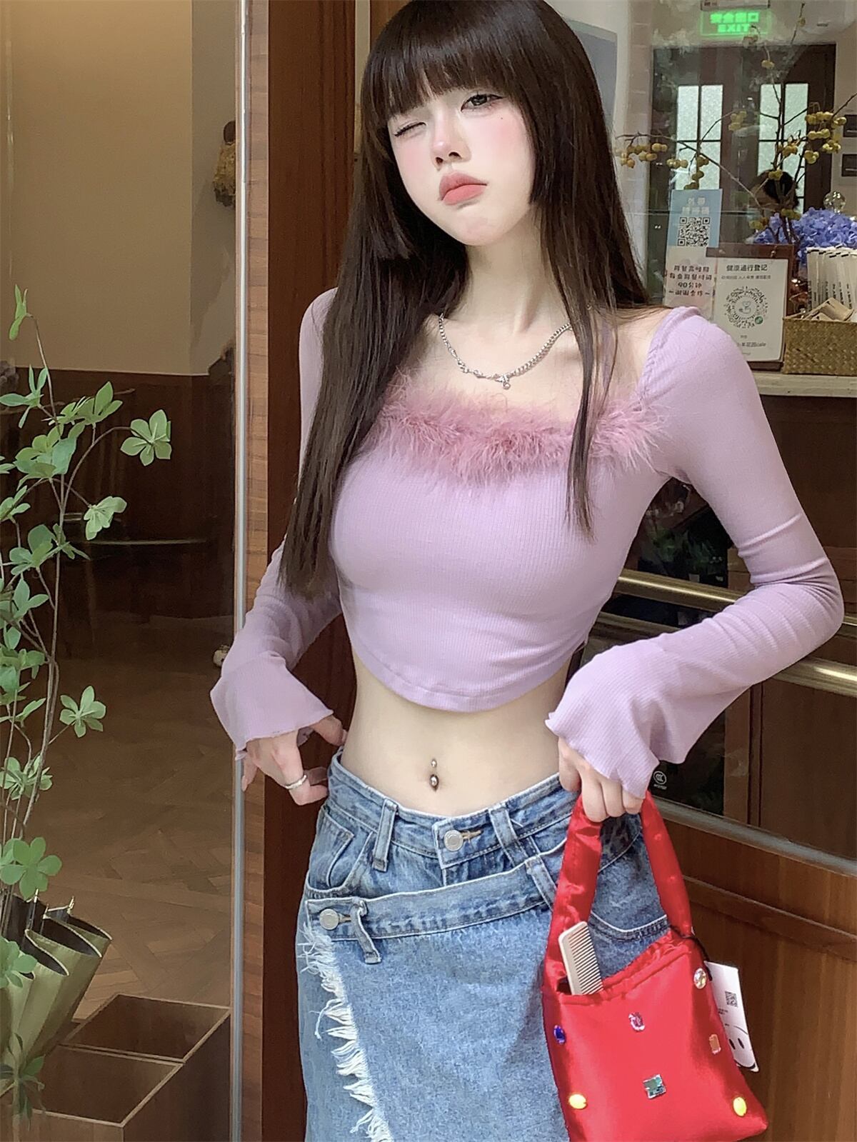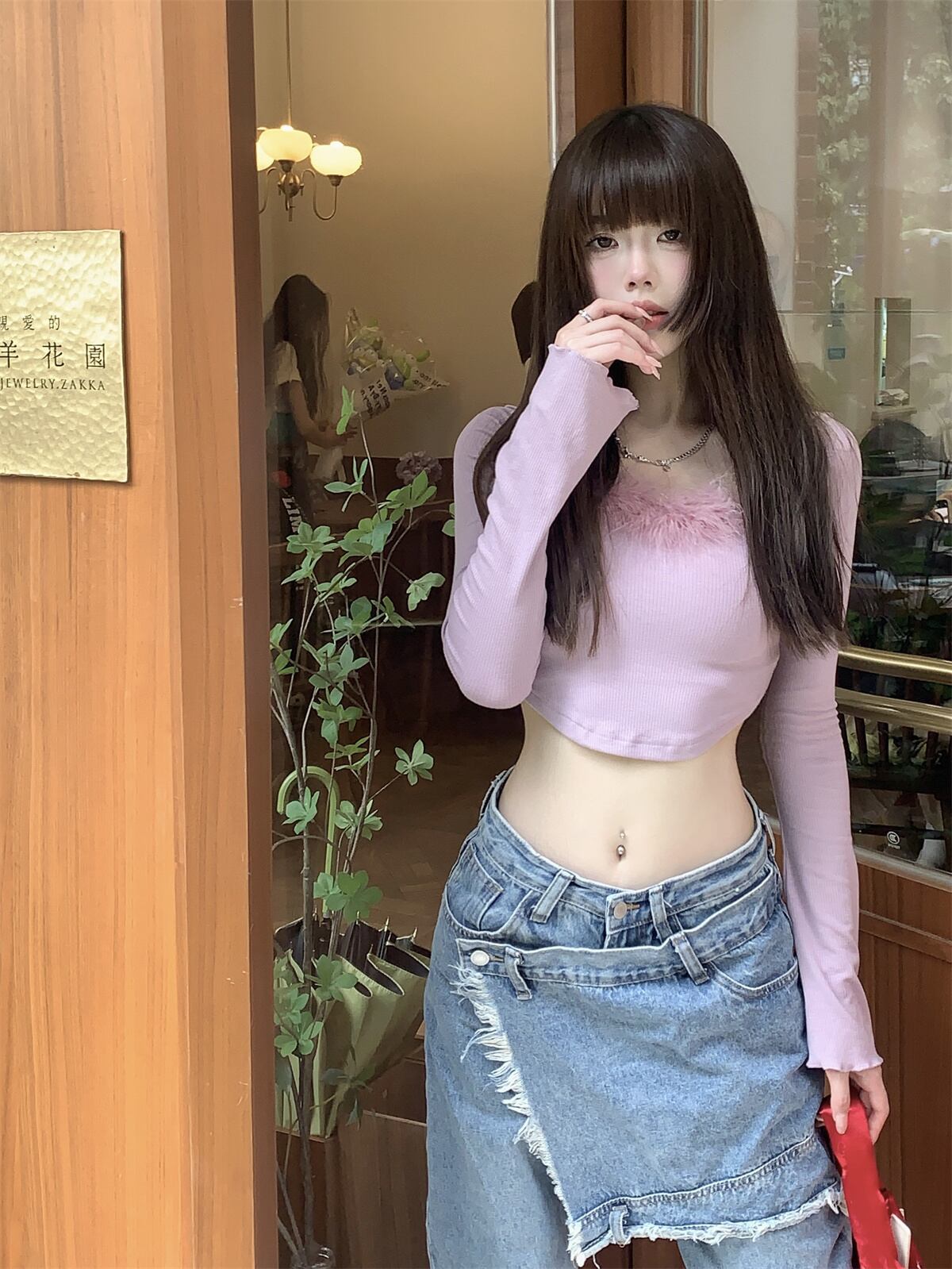 ホルターTシャツ オータムスリムショートトップス ロング ふわふわ 秋物 10/5 秋冬 オータム ウインター ナチュラル mi4642163492915