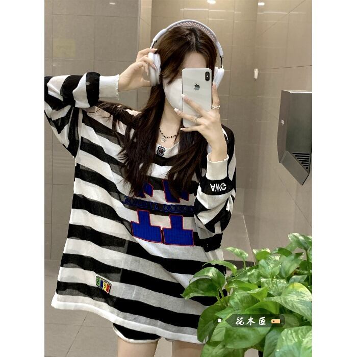 刺繍ルーズストライプTシャツ オータム薄手トップス ロング 秋物 10/5 秋冬 オータム ウインター ナチュラル mi4626688684204