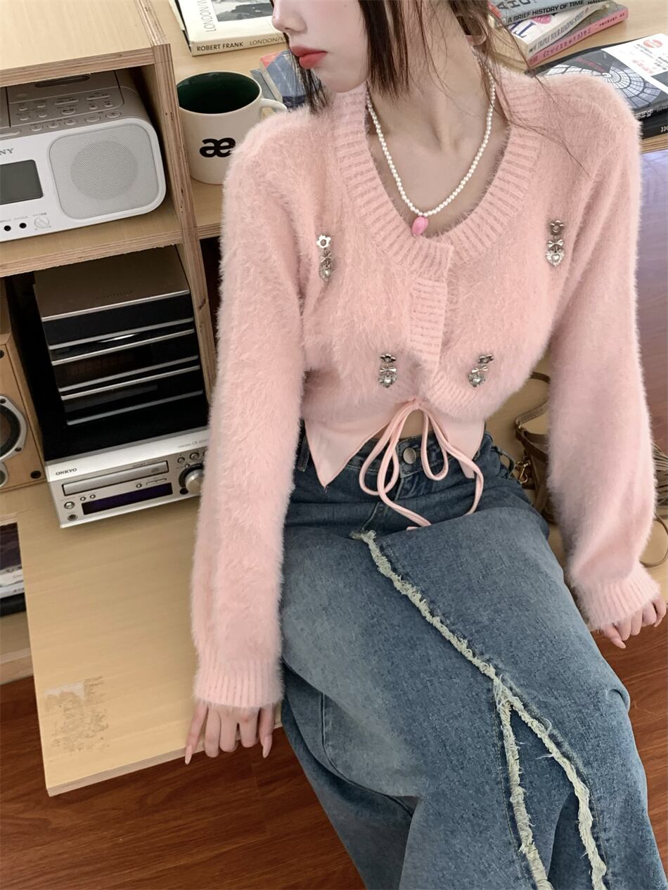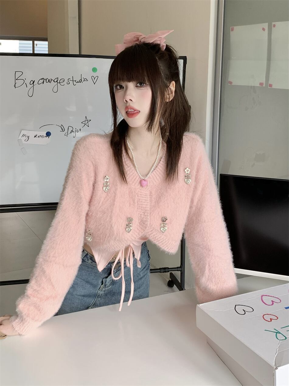 色:ピンクキャミソール,ピンクのニットカーディガン