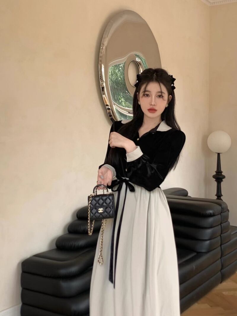 ベルベットドレス オータムスタンダードスタイルウェストスカート ロング レトロ 秋物 10/5 秋冬 オータム ウインター ナチュラル mi4683879133629