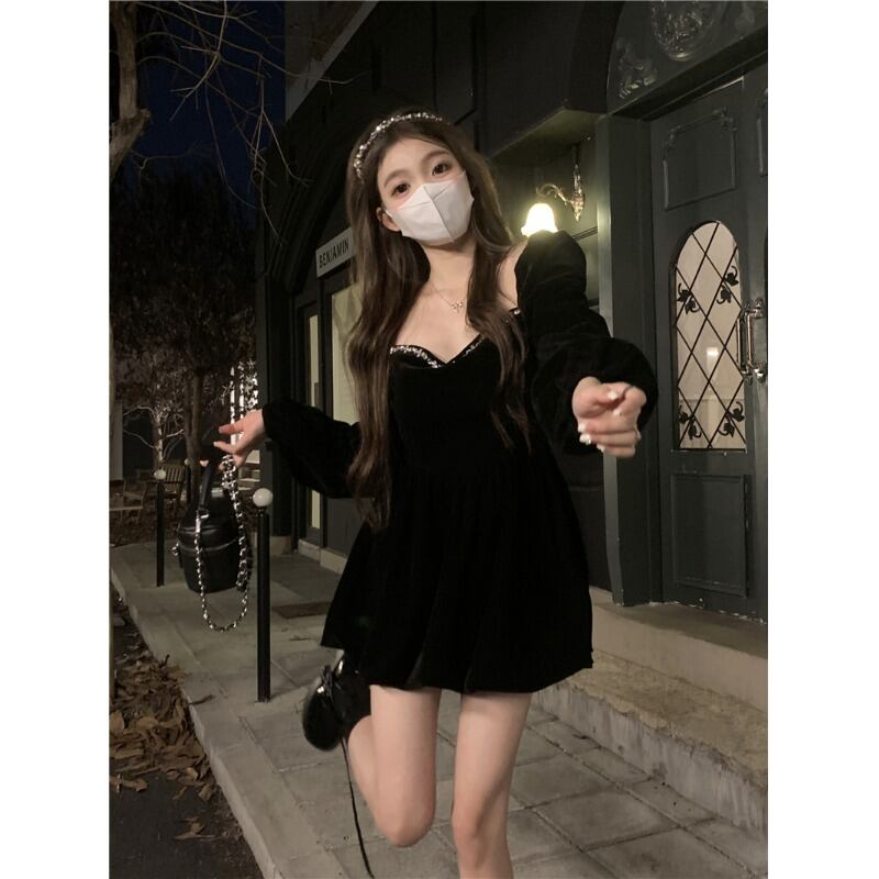 ベルベットスリムフィットVネックドレス オータムブラック ロング 秋物 10/5 秋冬 オータム ウインター ナチュラル mi4682672019600