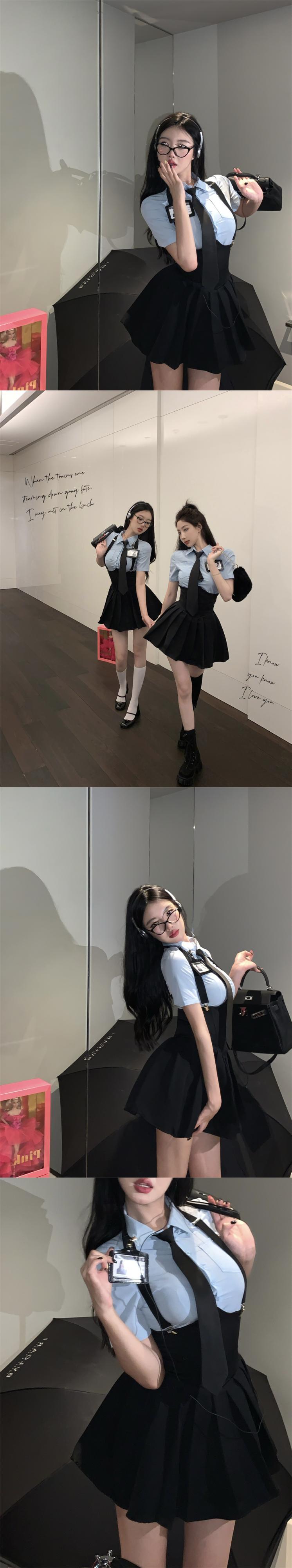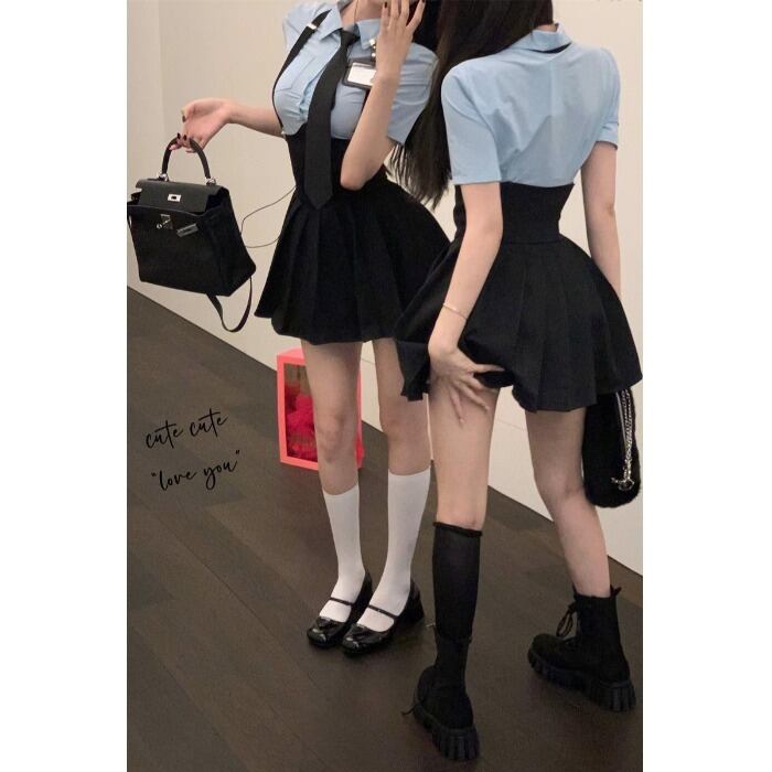 スタイルサマーブルーシャツ プリーツスカート セット 大人ガーリー スウィート キュート カジュアル 夏物 10/5 秋冬 オータム ウインター ナチュラル mi4647721023753