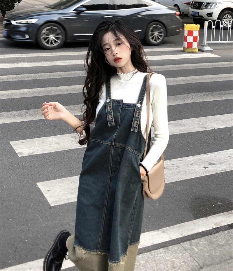 色:白のニット服,カラーブロックデニムサスペンダースカート