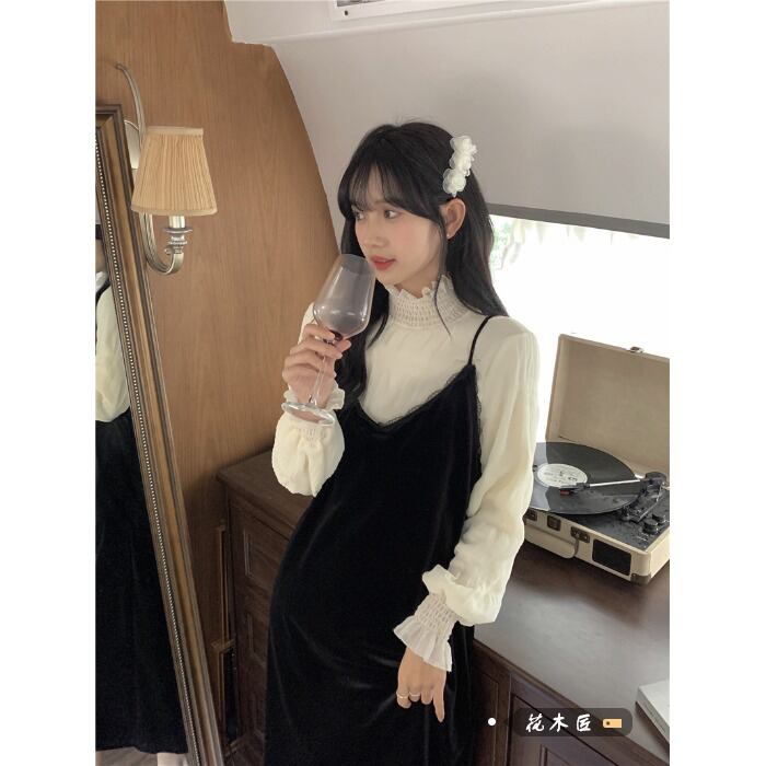 レースブラックベルベットドレス オータムスタンダードスカート レトロ 秋物 10/5 秋冬 オータム ウインター ナチュラル mi4699100398161