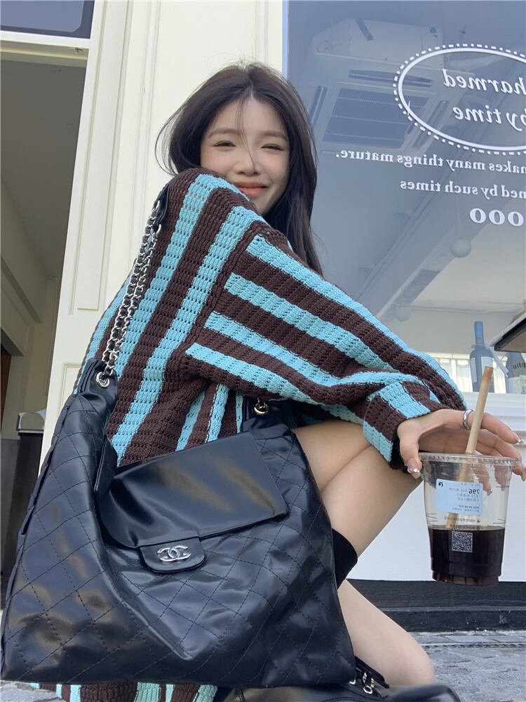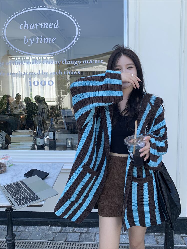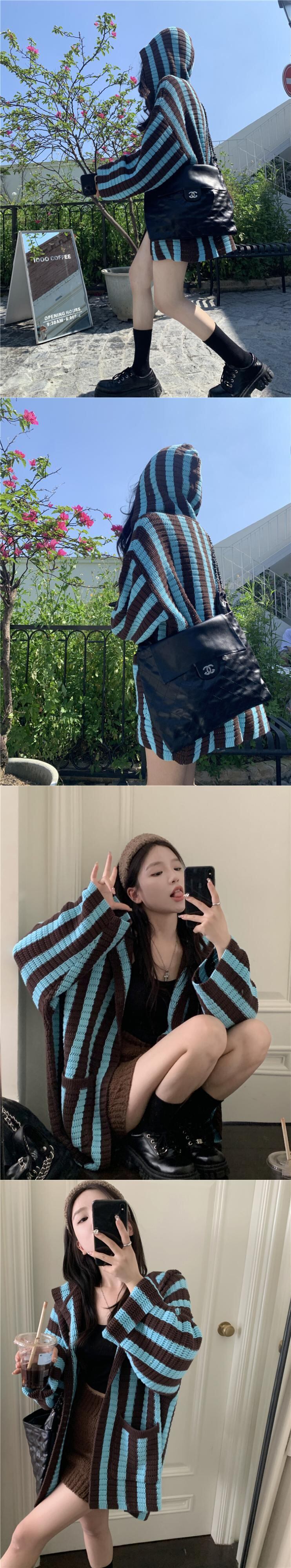 スタンダードブルーストライプフードセーター コート オータムニットカーディガンルーズトップス レトロ 秋物 10/5 秋冬 オータム ウインター ナチュラル mi4621418846877