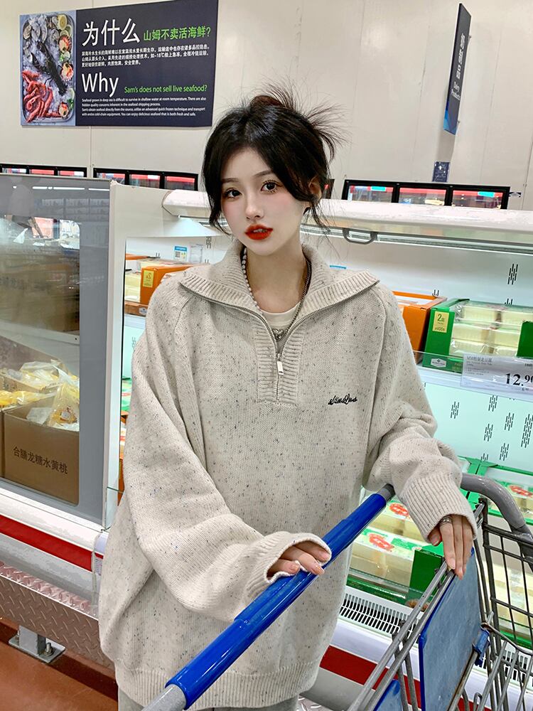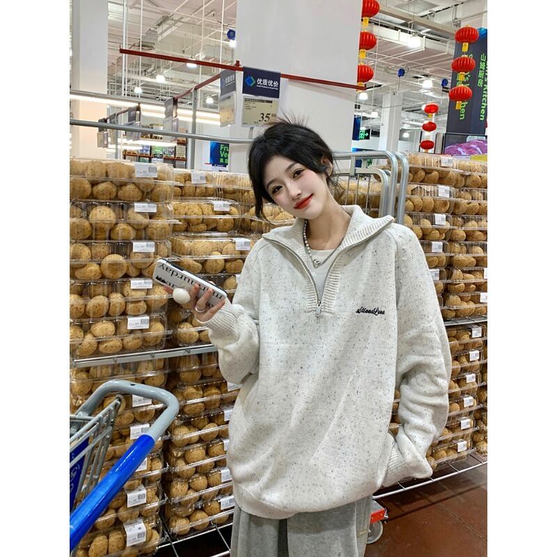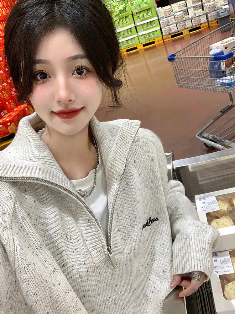 ホワイトジッパーカラーセーター オータムルーズニットトップス 秋物 10/5 秋冬 オータム ウインター ナチュラル mi4647789208320